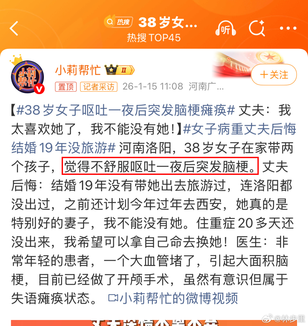 38岁女子呕吐一夜后突发脑梗瘫痪呕吐,是脑梗的症状。所以,不是呕吐一夜后突发脑梗,是脑梗了才呕吐。