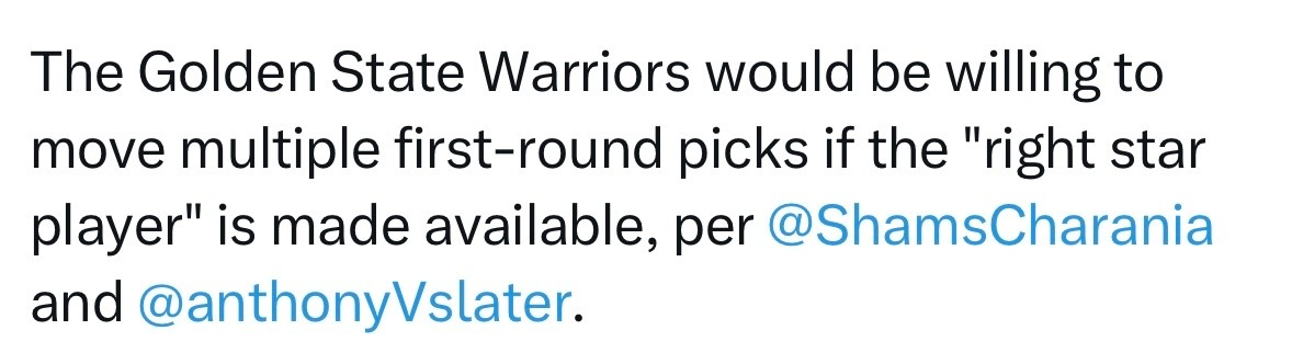 Shams:若有合适的球星可供交易,金州勇士队愿意拿出多个首轮选秀权。