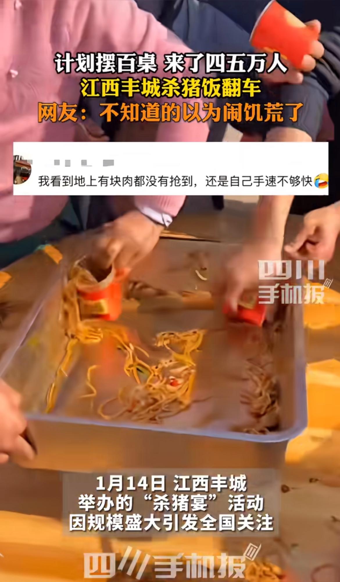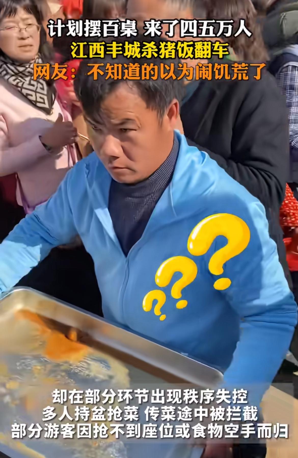 1月14日,江西丰城网红卧龙哥学办杀猪宴翻车,闹大了!本只备100桌,结果来了四五万人。现场那叫一个乱,菜不够大家抢,有人还掀桌,好多人饿着肚子走。 这事儿啊,一方面是善意没边界。卧龙哥想分享热闹是好事,可没算好能接待多少人就喊全国网友,和小区阿姨分粽子没说清数量,最后抢得一团糟一样。另一方面,免费的诱惑让人丢了体面。有人上手抓菜、整盘端走,抢不到还掀桌,真没素质。想办这类活动,得提前定规矩、别高估自己能力、找专业人帮忙,不然就成闹剧啦!