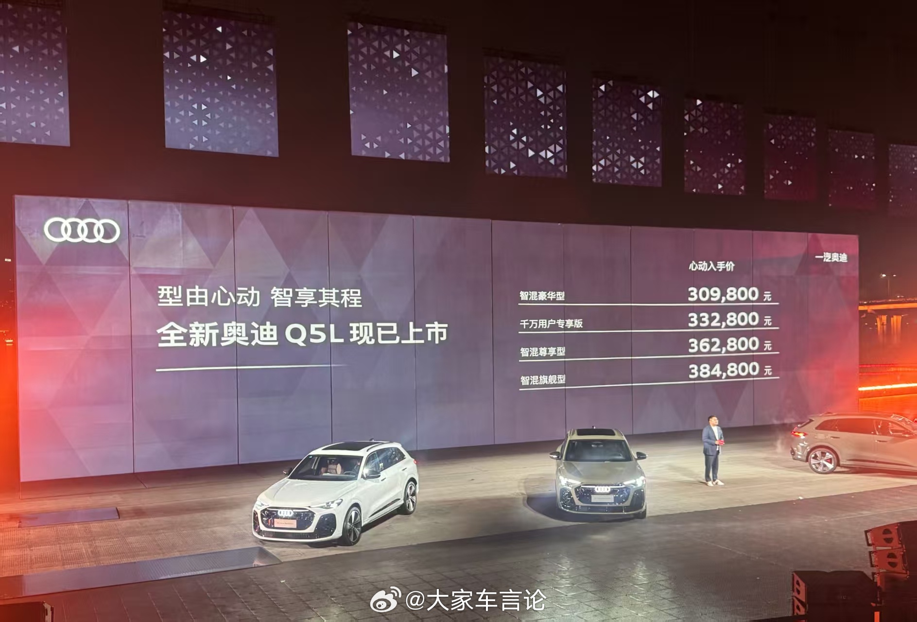 全新奥迪Q5L亮相,30.98万起,限时可享五大礼遇。基于PPC豪华燃油智能平台打造,搭载EA888 EVO5发动机及第五代quattro智能四驱,标配华为乾崑智驾。更智能化,价格还更友善的奥迪,大家还满意嘛?全新奥迪q5l