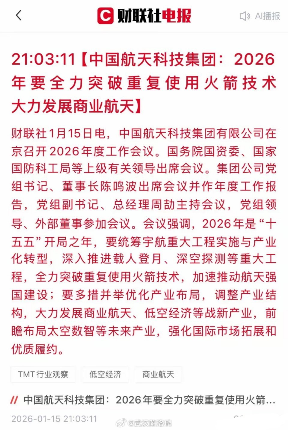大利好!国家航天强国2026定调了!火箭回收+商业航天全力突破,核心龙头股迎布局良机!昨天,中国航天科技集团在京召开重磅会议,国务院国资委、国家国防科工局等上级有关领导共同出席,定调2026年“十五五”开局之年的战略方向!会议明确两大突破性目标:全力突破重复使用火箭技术、大力发展商业航天,同时布局低空经济、太空数智等未来产业。这标志着我国航天事业正式进入“低成本、高频次”的商业化新时代,相关产业链将迎来历史性发展机遇。核心受益方向梳理:1.火箭回收与重复使用技术会议明确提到的“全力突破”方向,直接利好具备液体火箭发动机、先进材料与回收控制技术的公司。· 航天动力:大股东是航天科技集团第六研究院,即中国航天液体火箭发动机的唯一研制单位。可重复使用火箭最核心、最关键的瓶颈技术就是高性能、可多次点火的液氧煤油/甲烷发动机。· 航发动力:航空发动机龙头,其在高温合金、精密制造等领域的技术积累,对火箭发动机研制有重要支撑作用。· 抚顺特钢/钢研高纳:高温合金材料的核心供应商。火箭发动机热端部件(如涡轮盘、燃烧室)对材料耐高温、抗疲劳性能要求极高,可重复使用更将大幅提升其需求与价值。· 楚江新材:箭体碳纤维复合材料核心配套。· 光威复材/中简科技:碳纤维复合材料龙头,用于火箭箭体、发动机壳体等关键部位的轻量化,是提升运载效率的关键。· 菲利华:国内石英纤维材料唯一批量供应商,广泛应用于火箭的防热隔热部件,是不可或缺的关键材料。· 航天电子:为运载火箭提供测控通信、惯性导航、控制系统等核心电子设备。· 北方导航:在惯性导航领域技术深厚,产品可应用于火箭飞行控制。· 航天机电:主营汽车零部件和光伏,航天业务占比小,关联度相对间接。· 中天火箭:隶属航天科技四院,主营小型固体火箭及炭纤维材料,技术可延伸。· 航天彩虹:主营无人机,但其实际控制人为中国航天空气动力技术研究院,在空气动力、复合材料方面有技术积淀,与火箭再入气动、材料相关。2. 商业航天应用与运营政策明确“大力发展”,卫星互联网(太空数智)建设将全面提速,从制造、发射到应用的全产业链将被激活。· 中国卫星:航天科技五院旗下小卫星/微小卫星制造平台,将直接受益于商业星座组网带来的巨量卫星需求。· 中国卫通:航天科技集团旗下卫星运营国家队,垄断国内通信卫星运营。商业航天和太空数智的发展,使其成为下游流量和数据服务的核心通道,地位至关重要。· 航天宏图/中科星图:太空数据应用入口,迎来需求井喷。· 上海瀚讯:军用宽带通信技术领先,其技术可平移到卫星互联网的终端和载荷,潜力较大。· 海格通信/北斗星通:在卫星导航与通信终端领域拥有成熟技术和市场基础,是连接卫星互联网与用户的关键环节。· 华力创通:在卫星通信芯片和模组方面具备核心技术,已深度参与国内卫星互联网项目。· 星网宇达:惯性导航、卫星通信产品,用于卫星及地面终端。·航天智装:子公司轩宇空间从事星载计算机、测试仿真系统。3. 关键材料与高端制造航天产业的升级,离不开上游高端元器件、芯片和测试验证的支撑。· 紫光国微/复旦微电:在FPGA、安全芯片等高可靠航天芯片领域积极推进自主化,是航天电子系统自主可控的关键。· 鸿远电子/火炬电子:主营多层陶瓷电容器(MLCC) 等电子元器件,是航天、军工领域高可靠供应链的核心环节。· 新雷能:特种电源龙头,产品广泛用于航天器及地面设备,是高端装备的“心脏”。· 苏试试验:提供力学、气候等环境试验服务与设备,是确保火箭、卫星可靠性的必经环节。4. 低空经济与空天地一体化会议首次将商业航天、低空经济、太空数智三大未来产业并列提出,预示空、天、地一体化网络建设将全面协同推进。· 中信海直:通用航空及海上石油飞行服务龙头,在低空运营场景中占据先机。· 四川九洲:空管系统与设备重要供应商,受益于低空飞行管理体系建设。· 万丰奥威:通过子公司万丰飞机,成为通用飞机全球核心制造商,直接受益于低空航空器市场需求爆发。· 宗申动力:积极布局航空发动机及新能源动力系统,是低空飞行器核心动力潜在供应商。航天强国战略已进入产业化冲刺阶段,2026年将成为行业发展的里程碑式节点。核心技术突破+商业模式创新,双重驱动下,相关上市公司业绩弹性值得期待!