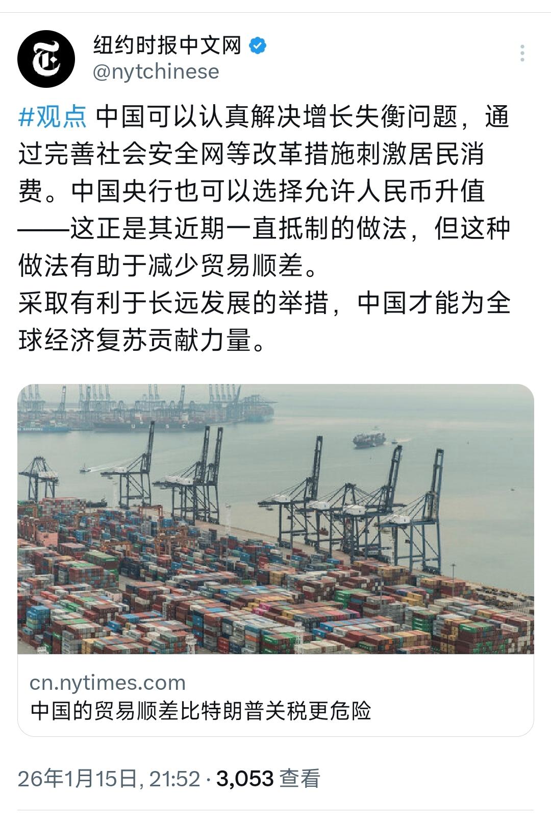 美国不仅不考虑自身问题,还给中国出馊主意!1月15日,纽约时报中文网发文:“中国的贸易顺差比特朗普关税更危险。中国可以认真解决增长失衡问题,通过完善社会安全网等改革措施刺激居民消费。中国央行也可以选择允许人民币升值——这正是其近期一直抵制的做法,但这种做法有助于减少贸易顺差。采取有利于长远发展的举措,中国才能为全球经济复苏贡献力量。” 说白了,美国就是想甩锅给中国,想让中国无条件的接受美国的关税增长。甚至用 “全球经济复苏” 的道德枷锁,逼迫中国放弃自身的经济发展节奏,为美国的结构性矛盾买单。 要知道,中国贸易顺差的形成,很大程度上和部分国家对中国设置的出口限制有直接关系,像美国的芯片,日本、德国的机床等等,他们完全不想卖给中国,顺差自然拉大了。 而普通产品顺差大,是市场竞争的结果,中国拥有全链条产业链,中国出口多,说明生产效率、质量能得到世界的认可,并且这个顺差是可以通过政策控制的,像之前菲律宾进口香蕉,日本进口水产品等等, 更关键的是,中国一直秉持着互惠互利的合作模式,与各国正在进行平等贸易往来。像斯里兰卡南部铁路、孟加拉达阿高速等等,这些都是“授之以鱼也授之以渔”的务实合作典范。 说实话,中国坚持走的这一条路,不仅可以实现中国的经济稳定增长,还在为全球经济复苏做贡献。而美国的挥舞关税大棒,不仅让国内物价上涨,还直接冲击了全球产业链的稳定,牵连到无数依赖国际贸易的国家,是在切实搅动全球经济的稳定根基。 说到底,全球经济的复苏,靠的不是谁对谁挥舞关税大棒,也不是谁向谁单方面让利,而是平等协商、互利共赢的合作。美国若真有心为全球经济负责,就该收起霸权思维,放下关税武器,与各国一道完善多边贸易规则,这才是正道,也是唯一的出路。
