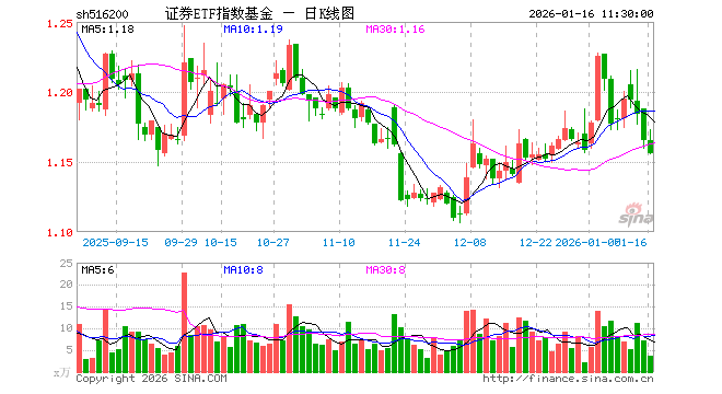1月16日,截止午间收盘,证券ETF指数基金(516200)跌0.77%,报1.156元,成交额420.14万元。证券ETF指数基金(516200)重仓股方面,东方财富截止午盘跌0.29%,中信证券跌0.32%,国泰海通跌1.42%,华泰证券跌1.07%,广发证券跌0.67%,招商证券跌0.88%,东方证券跌1.13%,申万宏源跌0.57%,兴业证券跌0.72%,中金公司跌0.60%。