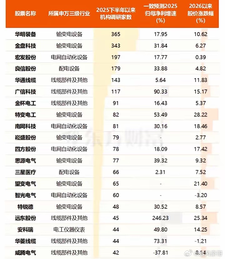 4万亿电网投资在路上,哪些企业将受益:一、特高压主网(核心外送通道)一次设备:中国西电(特高压变压器/电抗器龙头)、特变电工(换流变压器市占领先)、平高电气(GIS/断路器核心供应商)二次设备:国电南瑞(二次设备绝对龙头,特高压保护控制市占高)、许继电气(换流阀技术领先,柔直核心) 核心驱动:跨区输电能力提升超30%,支撑“沙戈荒”与西南水电外送,特高压直流通道加速建设 二、配网与微网(末端升级)配网设备:思源电气(GIS出海龙头,海外营收增45%)、金盘科技(干式变压器领跑,海上风电特变优势)、华明装备(有载分接开关+节能改造)微网与终端:东方电子(配网自动化)、三星医疗(智能电表龙头)、海兴电力(电表出海) 核心驱动:城乡配网补短板,探索末端保供/离网微电网,配网投资占比持续提升三、储能与调节(新能源消纳)抽蓄:南网储能(抽蓄装机超千万千瓦,新型储能增速超50%)新型储能:阳光电源(逆变器+储能系统双龙头)、科陆电子(储能系统集成,订单破百亿)、科华数据(储能PCS+系统)核心驱动:抽蓄优化+新型储能规模化,保障新能源并网消纳 四、数智电网(AI+电网)主网数智:国电南瑞(电网AI平台+调度系统)、四方股份(智能保护+固态变压器SST) 终端数智:宏发股份(高压直流继电器龙头)、良信股份(数据中心/新能源电气)核心驱动:“AI+电网”专项,主配微协同平台,提升电网数字化与自主可控 五、新能源配套(发电+并网)海缆:东方电缆(海上风电电缆龙头,海风项目放量)充电桩:特锐德(充电设备+运营龙头,适配3500万台充电设施接入)核心驱动:年均2亿千瓦风光新增,充电设施接入需求激增 六、投资要点主线排序:特高压>储能>数智电网>配网>新能源配套,优先龙头与技术壁垒标的。