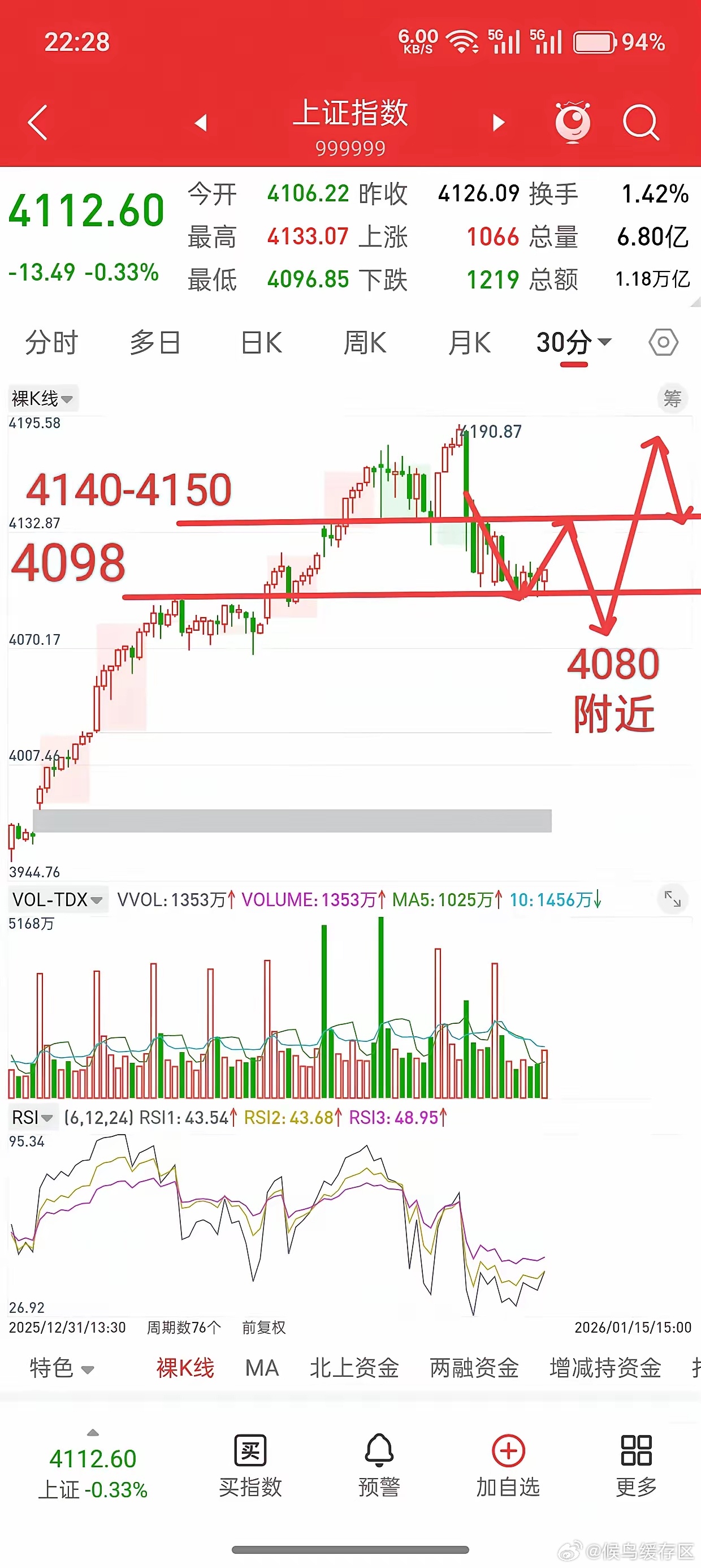 昨晚美股全线上涨,香港股指期货大涨,今日A股走势如何?先说观点,今天反弹看4140-4150左右,可能都到不了这里,然后还会砸下去,破一下前顶4098,到4080左右,然后在开启反弹。这样就会形成双底,最后再去挑战颈线4140-4150左右,后面站上,挑战前高。这种走势,既能起到洗盘效果,也会让底部想抄底的人踏空。10.30号-11.5号就是这样走的,突破前高3936加速拉升,后面回踩前高,甚至破一下,再反弹。(当时这波顶底做的堪称完美)而当下,操作上也很简单,只要遇到大跌就可以进场,比如昨天4098前顶附近提示可以博弈反弹,今天如果大幅反弹就离场,不要贪心即可。后面跌下来,还可以进。但是后面那个低点,可能会稍微低于昨天4096。会不会这样走,一起见证!财经观察官