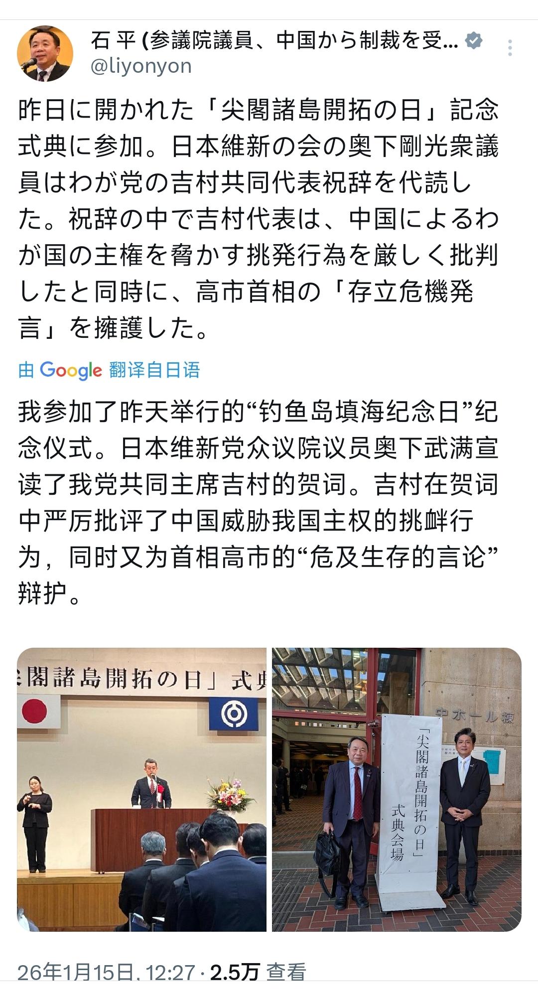 被我方制裁的大汉奸再次叫嚣!1月15日,日本参议员石平发文:“我参加了昨天举行的‘尖阁诸岛开拓日’纪念仪式。吉村在贺词中严厉批评了中国威胁我国主权的挑衅行为,同时又为首相高市的‘台湾涉及日本安危’辩护。” 说白了,石平这番发文,是“数典忘祖”的表现,试图用这种方式攀附右翼势力,和中国争夺主权。 要知道,“尖阁诸岛”这是在日本的称谓,在中国叫钓鱼岛,是钓鱼岛的附属岛屿,而钓鱼岛是中国的固有土地,是国际公认的事实。 并且,在二战结束后签订的《开罗宣言》和《波茨坦公告》中,就已限定了日本的领土范围仅限于本州、北海道、九州、四国及盟国所决定的其他小岛之内。钓鱼岛及其附属岛屿根本不在此列,从法理上早已明确钓鱼岛不属于日本。如今却被其认为是中国在挑衅,简直就是颠倒黑白、贼喊捉贼。 说实话,石平此番发文,就是确定要一条路走到黑了,已经彻底沦为了日本右翼反华的棋子,但有历史依据的中国根本不担心,只会把他这场跳梁小丑般的拙劣表演,当成一出贻笑大方的闹剧。 说到底,石平越是卖力叫嚣,越能反衬出他内心的虚弱与卑劣,其一再做出背叛民族、践踏主权的行径,最终只会被全体国人唾弃,被永远钉在民族的耻辱柱上。