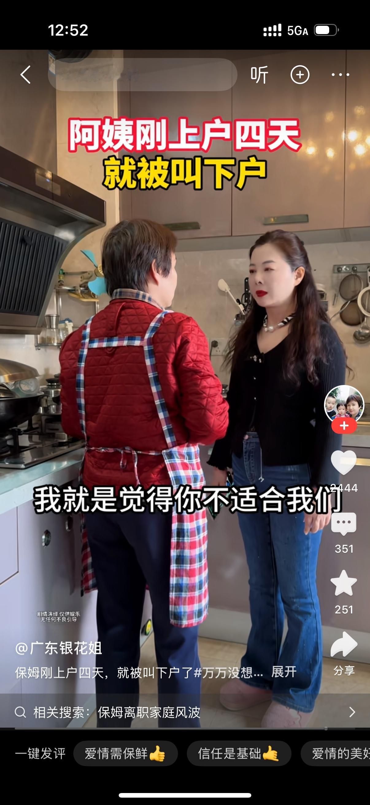 雇主找到在厨房干活的保姆说,阿姨,你收拾一下就下户吧。保姆听了之后一愣,问怎么回事?我刚来四天就让我下户?雇主说,没什么,就是感觉你不适合我们。保姆说,我这四天累死累活的给你干,纸巾都擦不出一点油来。你现在让我走,给我一个理由,不然我不走。雇主说,理由就是我们本就打算只找你做四天,现在时间够了,房屋也收拾的差不多了,你可以走了。保姆说,我呸,找四天你请钟点工啊。雇主脸都绿了。