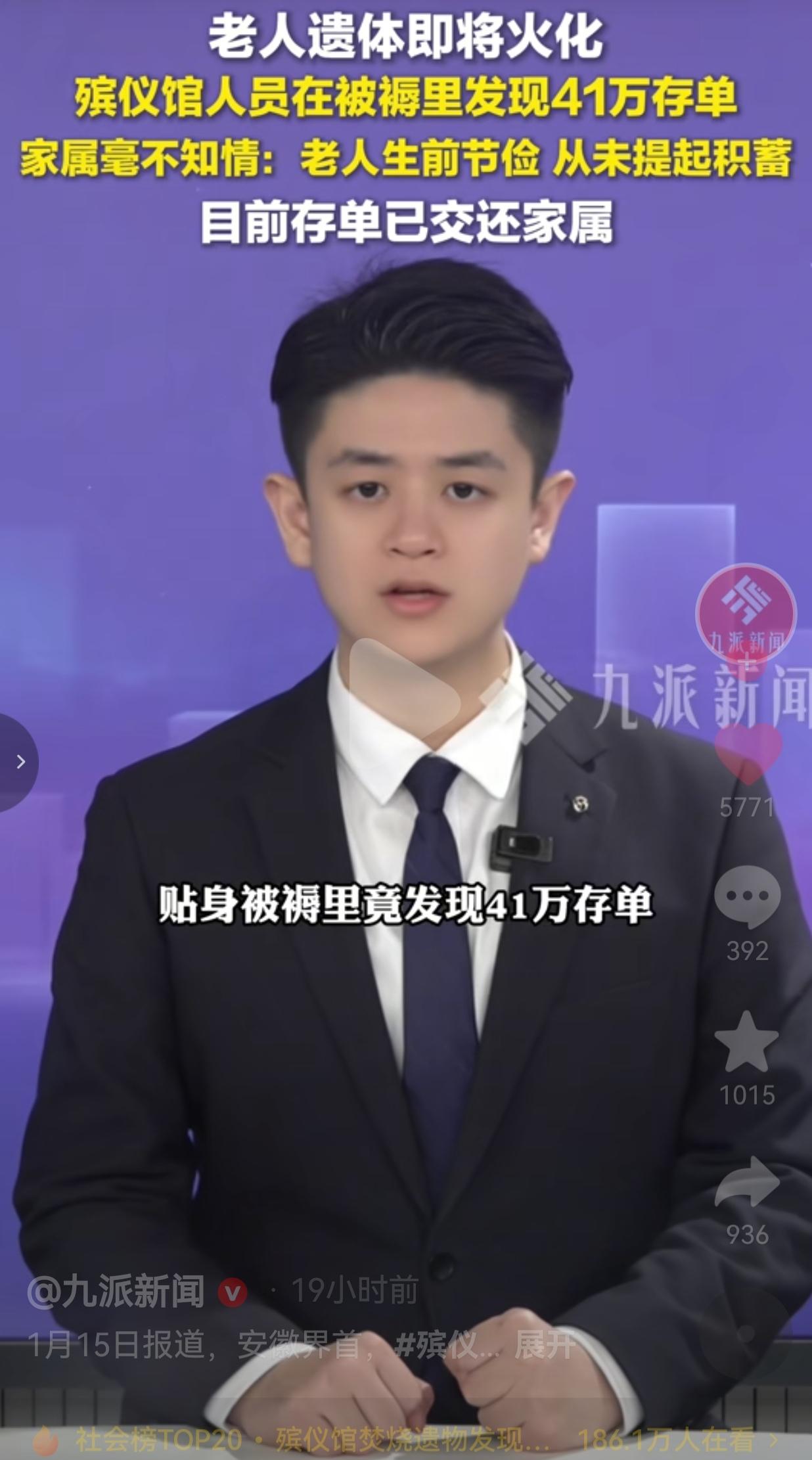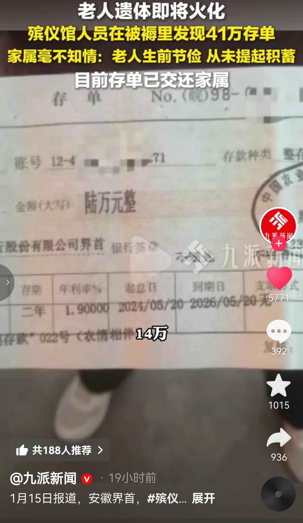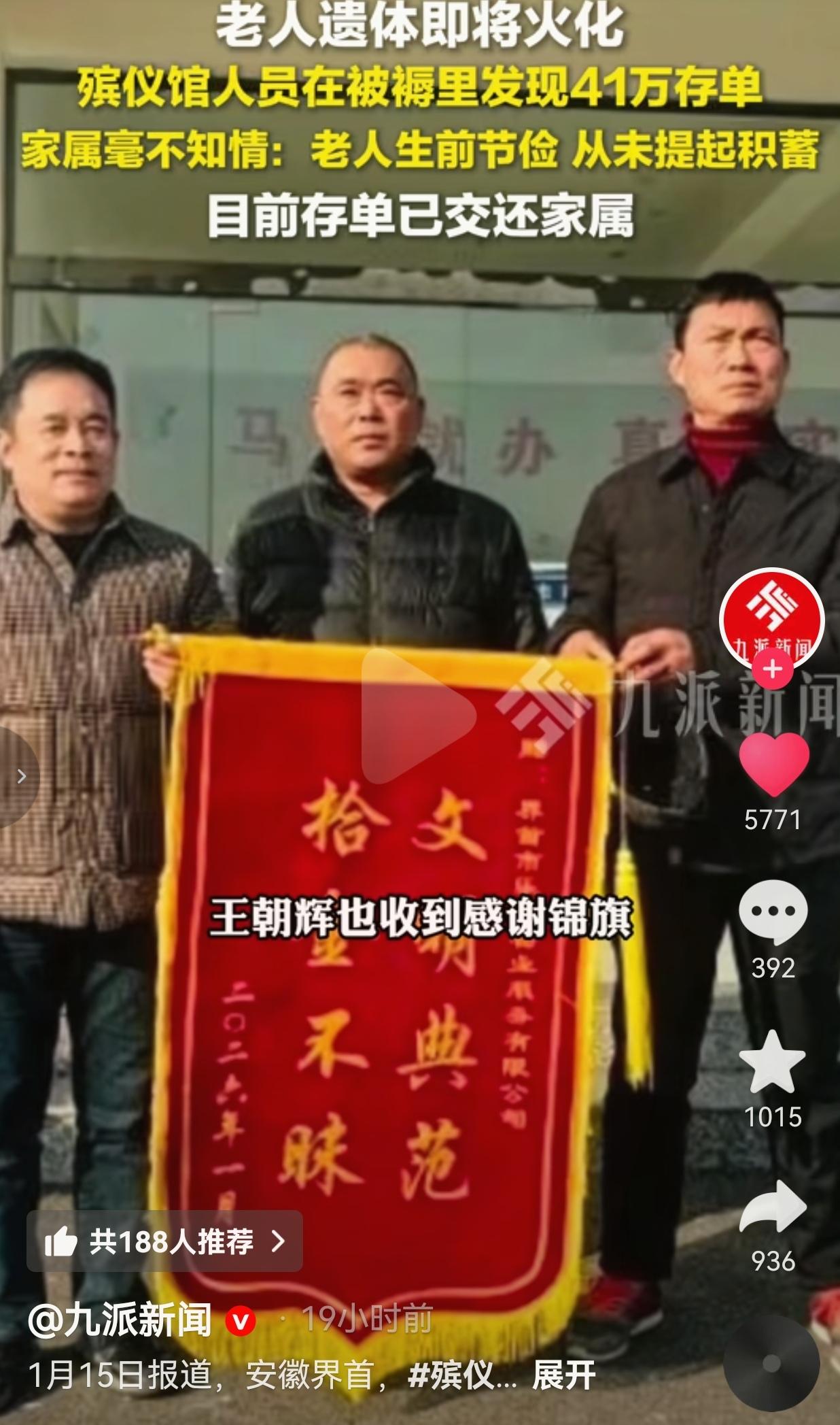老人遗体即将火化,贴身被褥里竟发现41万存单,家属竟然对此毫不知情。 1月15日,据大皖新闻的报道,安徽界首市殡仪馆,一位工作人员王朝辉介绍,当时有一位老人的遗体即将被火化,自己在整理老人的遗物时,发现老人贴身被褥有轻微鼓胀,小心拆开夹层后,竟找到三张银行存单,分别是21万、14万和6万,总计41万元。 面对这种情况,他立即联系上老人的家属,而家属只知道老人一辈子省吃俭用,从未跟家人提过自己有积蓄。多亏及时发现,否则这笔钱真的就打水漂了。 目前这三笔存单已经交还逝者家属,王朝辉也因这份细心和诚信,收到了家属送来的感谢锦旗。 网友看到后评论说:“为这位细心又诚信工作人员点赞!不然这笔钱就真的没了。” 还有的网友说:“老一辈的人真的太不容易了,苦了自己一辈子,只为儿女过得好。” 也有的网友说:“老人去世前,为什么不跟子女说自己的存款呢?难道不想把这笔钱给儿女吗” 我想,这样做肯定不是老人的初衷,或许老人记忆已经模糊了很多年,记不住也情有可原。 但是,我想这41万存单,是老人一辈子的省吃俭用,是他对生活的谨慎,也是对家人无声的牵挂。 他舍不得为自己花一分钱,却把所有的积蓄都留给了家人,这份藏在存单里的爱,沉重又动人。 而王朝辉的举动,也让我们看到了普通人身上的善良与责任,一份细心,不仅帮家属挽回了财产,更守住了老人留给家人的最后牵挂。 通过这事,也让我们明白:真正的亲情,从来不是轰轰烈烈的付出,而是默默的守护和牵挂。 最后,希望我们都能多陪陪家里的老人,趁他们还在,好好孝顺,别等失去了才想起他们的好。到时候,除了遗憾,还是遗憾。 大家觉得呢?欢迎大家评论区讨论留言。