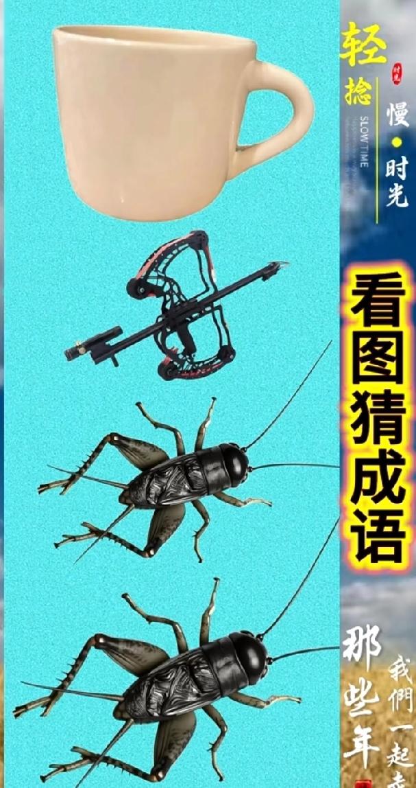 杯子、弓箭、两只蛐蛐!这张图里的成语,你能10秒内猜出来吗?