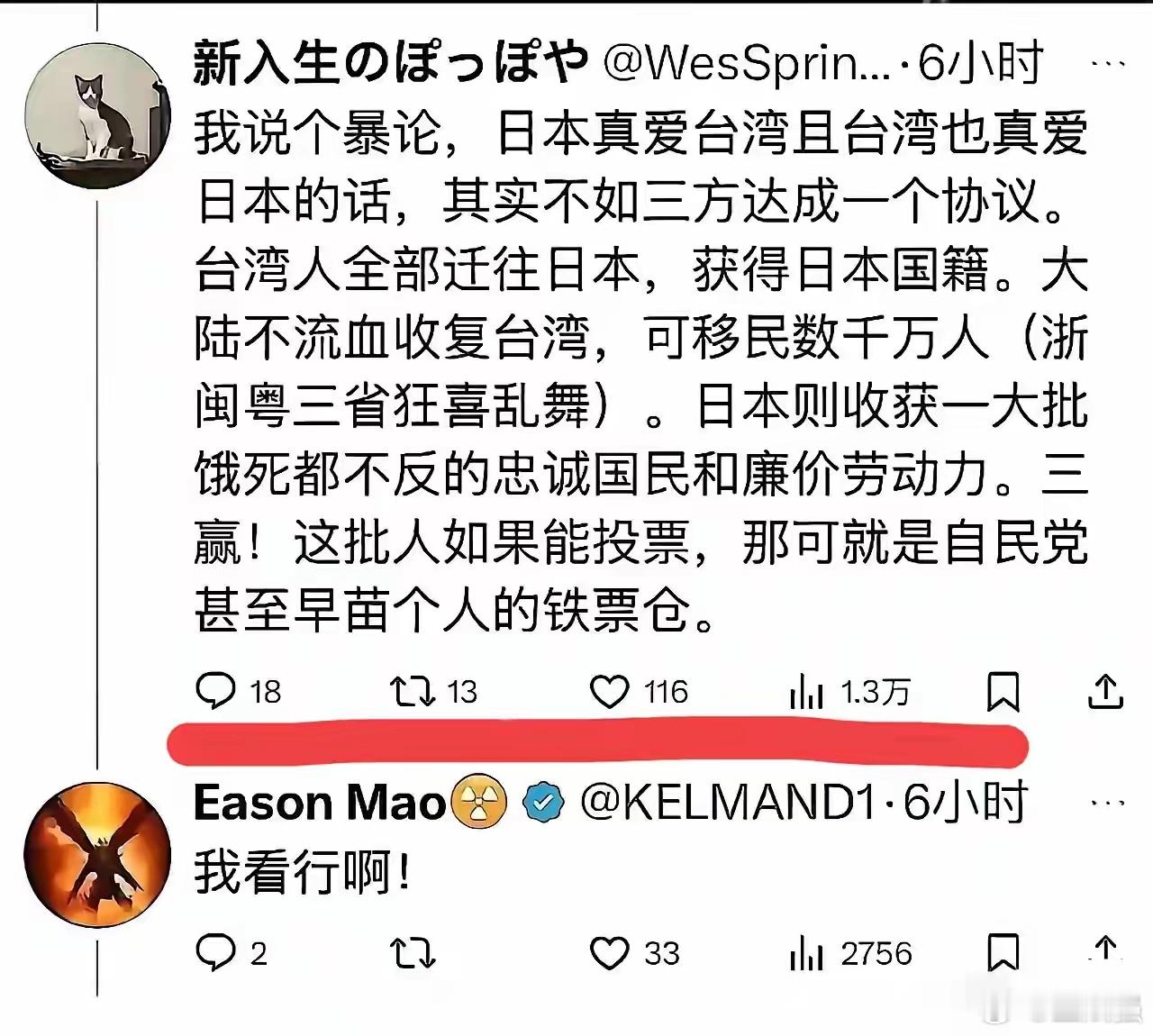 一位自称对中国事务颇有研究的日本网友最近在推特上发了一条推文,该条推文脑洞大开称:“如果日本真的那么‘爱台湾’,而部分台湾民众也高度认同日本,那不如干脆把台湾人‘整体迁到日本’,统一给予日本国籍。”云云。这条推文引发热议,没想到的是中国大陆网友多持支持的观点。