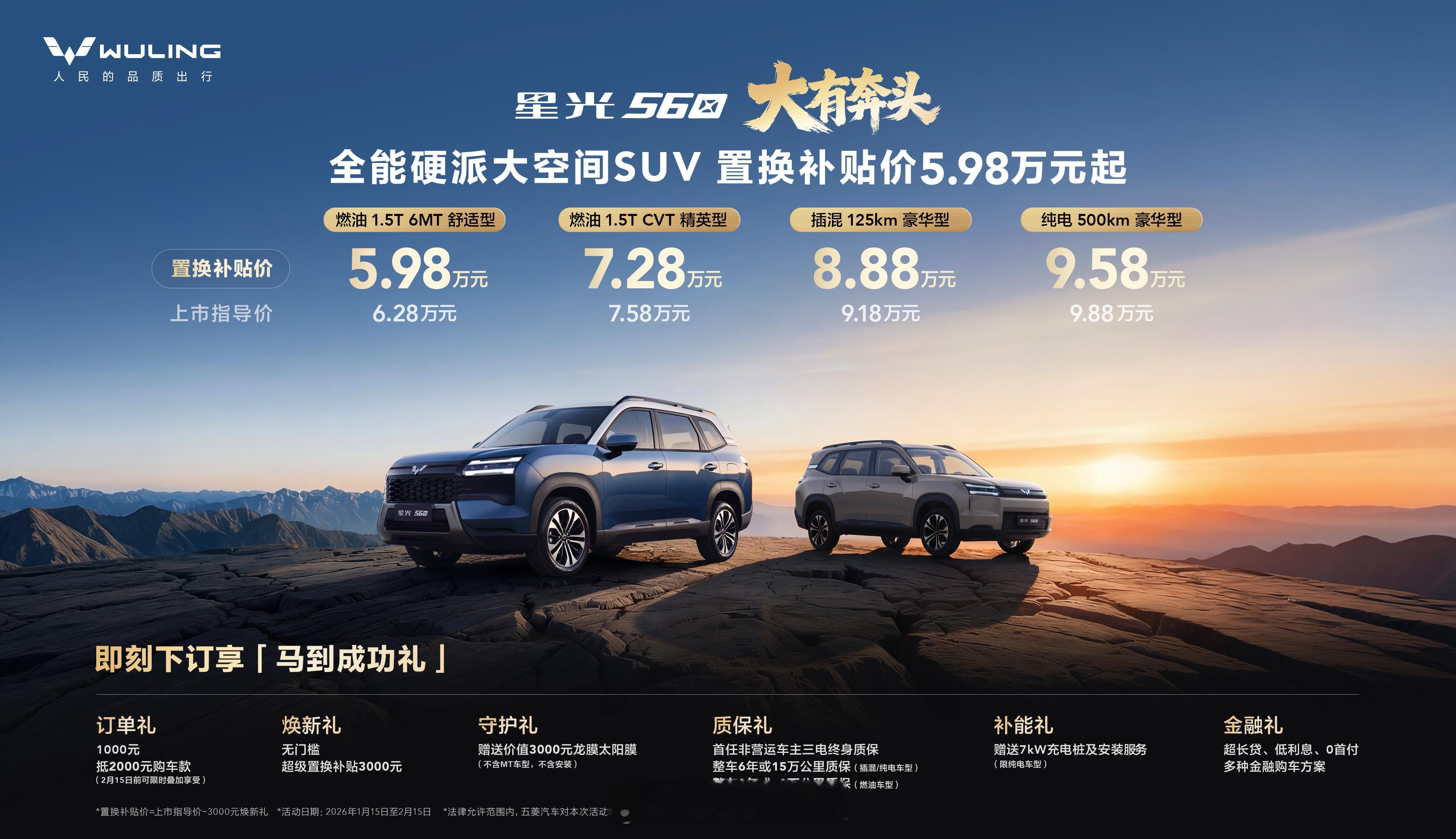 五菱星光560正式上市 硬派X家族设计+2810mm超长轴距,83%得房率+1945L巨能后备箱,空间实用到犯规~ 燃油/插混/纯电三动力任选,爬坡、长途、通勤全hold住,军工级安全车身+三电终身质保超安心!现在订车享置换补贴3000元+1000抵2000购车款,纯电版还送充电桩!6万级中型SUV天花板,家庭出行/露营自驾都适配,戳五菱官方渠道锁定福利,2026大有奔头星光560上市惊喜价59800起星光560空间夯爆了