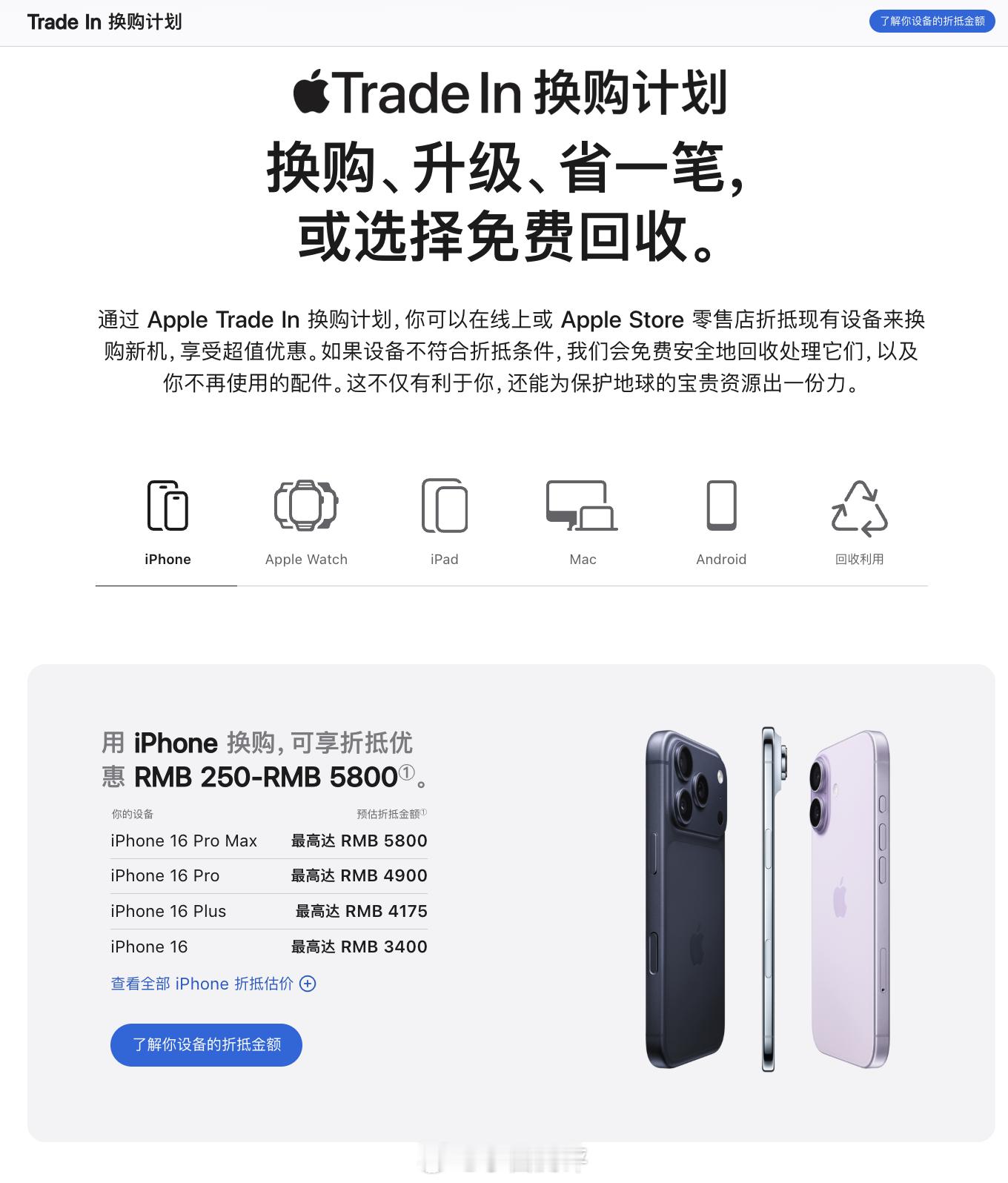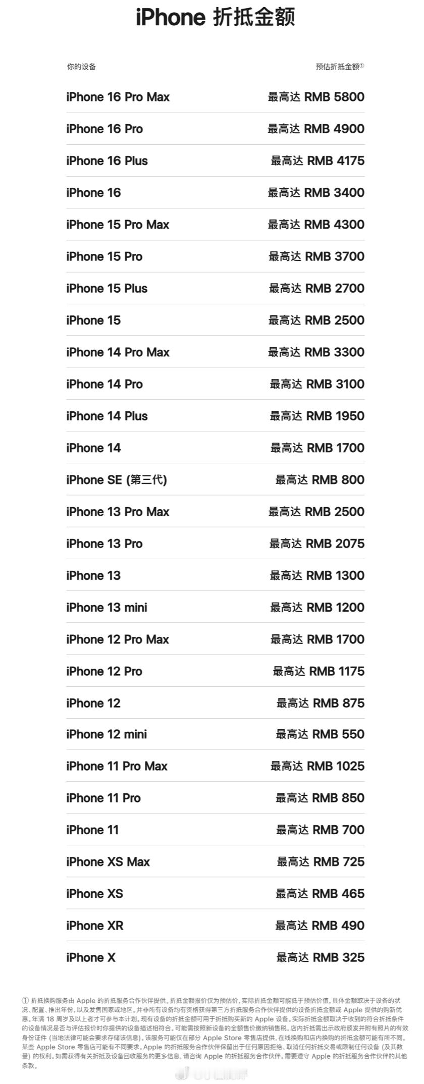 苹果以旧换新抵扣价再更新 苹果官网更新了以旧换新活动价格,iPhone 16 Pro Max最高可抵5800元(试了下1TB的16 Pro Max点进去显示5600),具体iPhone折抵估价参考图2,除了苹果外,华为OPPO小米vivo等品牌也可以折抵,但收录机型不够全,大家换机时处理旧机型会考虑官方的换购回收计划吗?