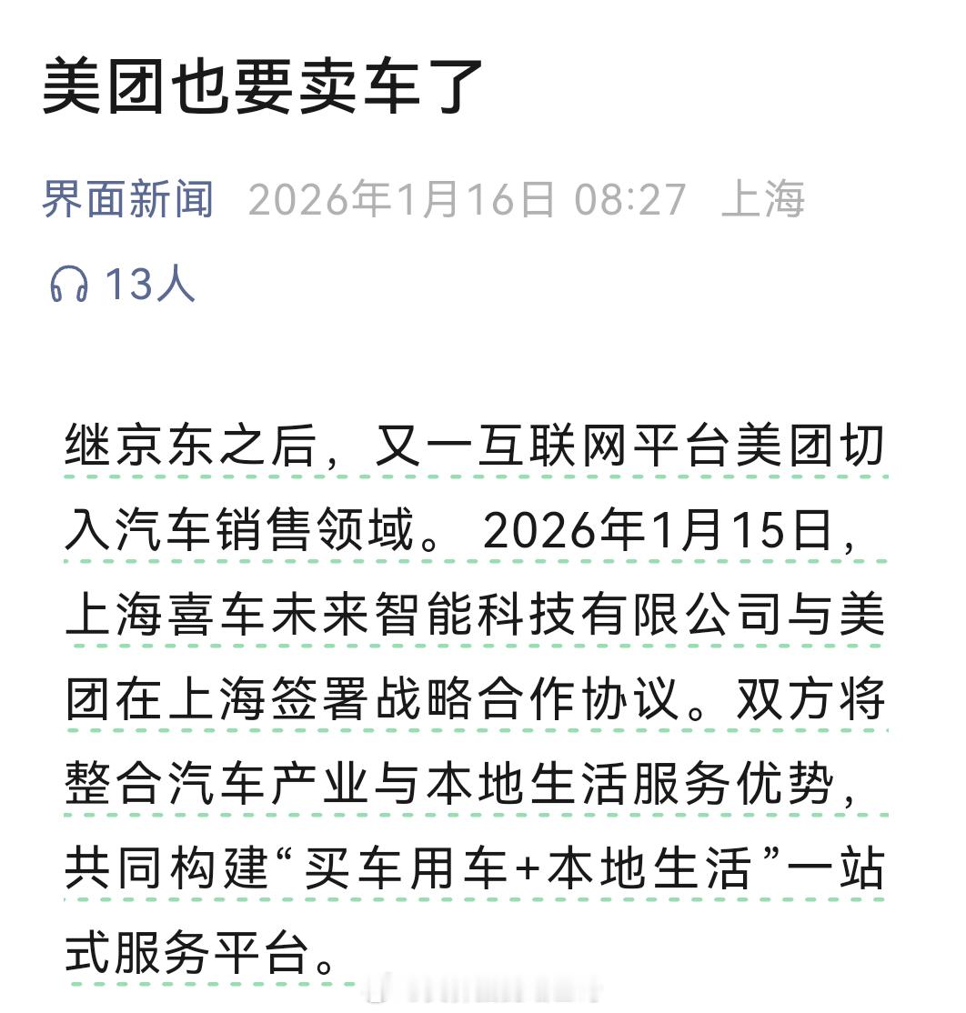 美团也要卖车了!我猜淘宝卖车也快了。京东,美团,可能还有淘宝、抖音会重塑汽车的网上销售和线下养护服务体系。传统车企的线上能力很差,这些线上平台他们有流量有入口,可以帮你卖车,再结合线下养护和周边贩卖,是个很好的生意。最后,估计途虎会被哪家并购