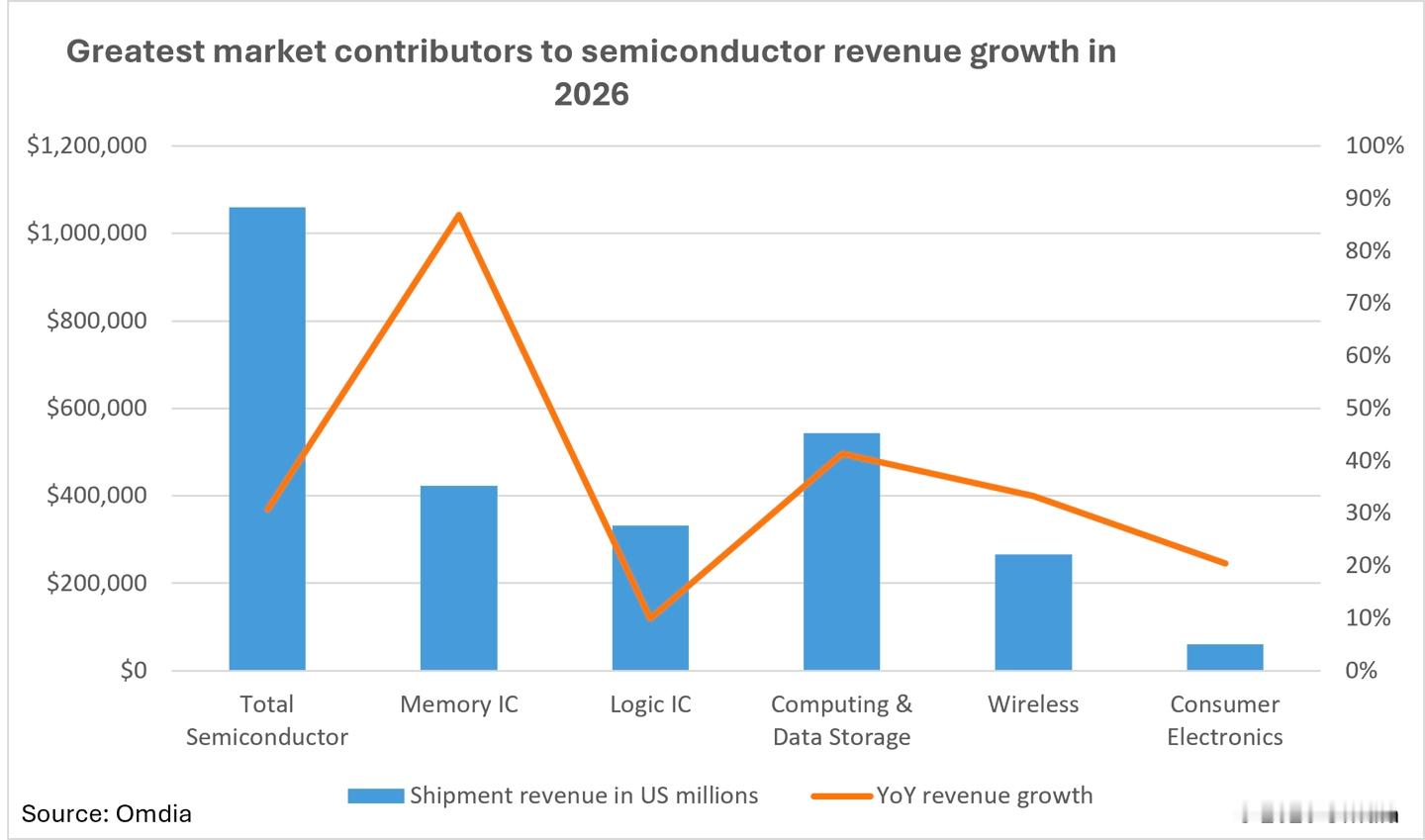 Omdia最新数据分析报告表示,由于AI市场的持续火热,2026年全球半导体行业收入将首次突破1万亿美元。万亿级别的市场,不敢想象,今年AI产品的迭代得有多疯狂。2025年全球半导体市场规模达7930亿美元,这还是同比增长21%后的数据。细分来看,从AI需求中受益最猛的是存储IC,其市场规模将在2026年增长约90%。而按领域划分,计算与数据存储在2026年将出现41.4%的同比增长,总额超5000亿美元。