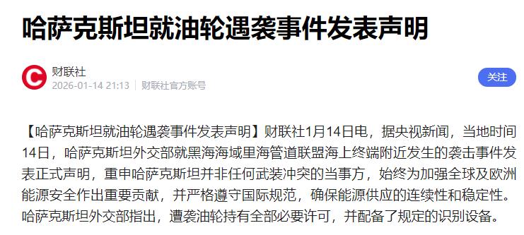 突发! 哈萨克斯坦外交部发表紧急声明! 2026年1月14日,哈萨克斯坦外交部突然紧急发声,一开口就把态度摆得明明白白,反复强调自己不是任何武装冲突的当事方,还特意加上一句要维护全球能源安全。 这波声明来得又快又急,明眼人一看就知道,里面全是藏不住的求生欲,说到底都是为了保住自己的能源命脉,在复杂的地缘博弈里求个安稳。 为啥哈萨克斯这么着急跳出来划清界限? 看看时间就知道门道,就在它发声明的当天,黑海海域里海管道联盟的海上终端附近,刚发生了油轮遇袭的事儿。 这可不是小事,那条里海管道对哈萨克斯坦来说,就是命根子一样的存在。 作为一个内陆国家,哈萨克斯坦的石油要出口到欧洲市场,七成以上都得靠这条管道输送,相当于全国大部分石油出口的活路都系在这根管子上。 现在管道周边出了袭击事件,哈方能不慌吗?一旦战火真的波及到这条管道,运输中断了,石油卖不出去,国家的经济就得跟着停摆,这可是关乎全国人生计的大事。 其实哈萨克斯坦这处境早就有点尴尬了,之前就吃过类似的亏。之前乌克兰用无人机袭击俄罗斯的天然气处理厂,结果顺带把哈萨克斯坦的油田产量砸下去三成。 因为那个俄罗斯的天然气厂,本来就是处理从哈萨克斯坦运过去的天然气的。 工厂一停工,哈萨克斯坦的油田生产链就跟着掉了链子,凝析油产量从每天三万五千多吨直接跌到两万多吨,损失可不是一星半点。 而且之前也出现过乌克兰无人机飞越哈萨克斯坦领土的情况,哈方当时就赶紧找各方沟通,就怕被卷进冲突里。 现在黑海这边又出了油轮遇袭的事,相当于在它的伤口上又踢了提,这时候不赶紧站出来澄清,万一被战火缠上,后果不堪设想。 对哈萨克斯坦来说,能源就是国家的经济支柱,而里海管道就是支撑这个支柱的关键。 这条管道不仅承担着七成以上的石油出口,输送量在全球石油供应里都占了超过1%的份额,不管是国内的经济运转,还是在国际能源市场的地位,都离不开它。 之前里海管道联盟的石油码头就曾遭过袭击,当时直接导致装船设施瘫痪,石油出口被迫中断,哈萨克斯坦的石油产量立马就降了6%,每天少产十几万桶油。 那次的教训已经够深刻了,现在周边再出乱子,它自然要第一时间跳出来划清界限,生怕自己被当成冲突的一方,断了这条生命线。 再往深了说,这背后全是地缘博弈的考量。现在周边的冲突局势本来就复杂,美俄之间的角力越来越激烈,之前就发生过美国在公海扣押俄罗斯油轮。 转头俄军就精准打击乌克兰港口设施的事儿,双方你来我往互不相让。 哈萨克斯坦夹在中间,两边都得罪不起,只能小心翼翼地保持平衡。 它既想维持和俄罗斯的合作关系,毕竟很多能源运输都要借道俄罗斯,又怕被卷入美俄的纷争里,更不想因为周边的冲突影响自己的能源出口。 所以这次一看到管道周边出了事,第一反应就是赶紧发声澄清,把自己摘干净,告诉各方“我不参与任何冲突,别把我卷进去”。 至于声明里提的“维护全球能源安全”,看似是站在国际角度说话,其实也是在给自己铺路。 这句话的潜台词很明显:我是全球能源供应的重要一环,我的能源运输安全了,全球能源市场才能稳定,希望各方都能顾及这一点,别来破坏我的能源设施。 这既是给自己造势,也是在提醒各方,别轻易动它的能源生命线,否则对谁都没好处。 说到底,哈萨克斯坦这波紧急澄清,根本不是多余的举动,而是权衡利弊后的必然选择。 在复杂的地缘局势里,一个内陆国家要守住自己的能源命脉,只能用这种最直接、最急切的方式表明立场,把求生欲拉满。 毕竟对它来说,不被卷入冲突,保住石油出口的活路,让国家经济能稳定运转,才是眼下最重要的事。 这声澄清背后,藏的全是一个国家在大国博弈中的无奈与谨慎,更是对自身生存发展的坚定守护。