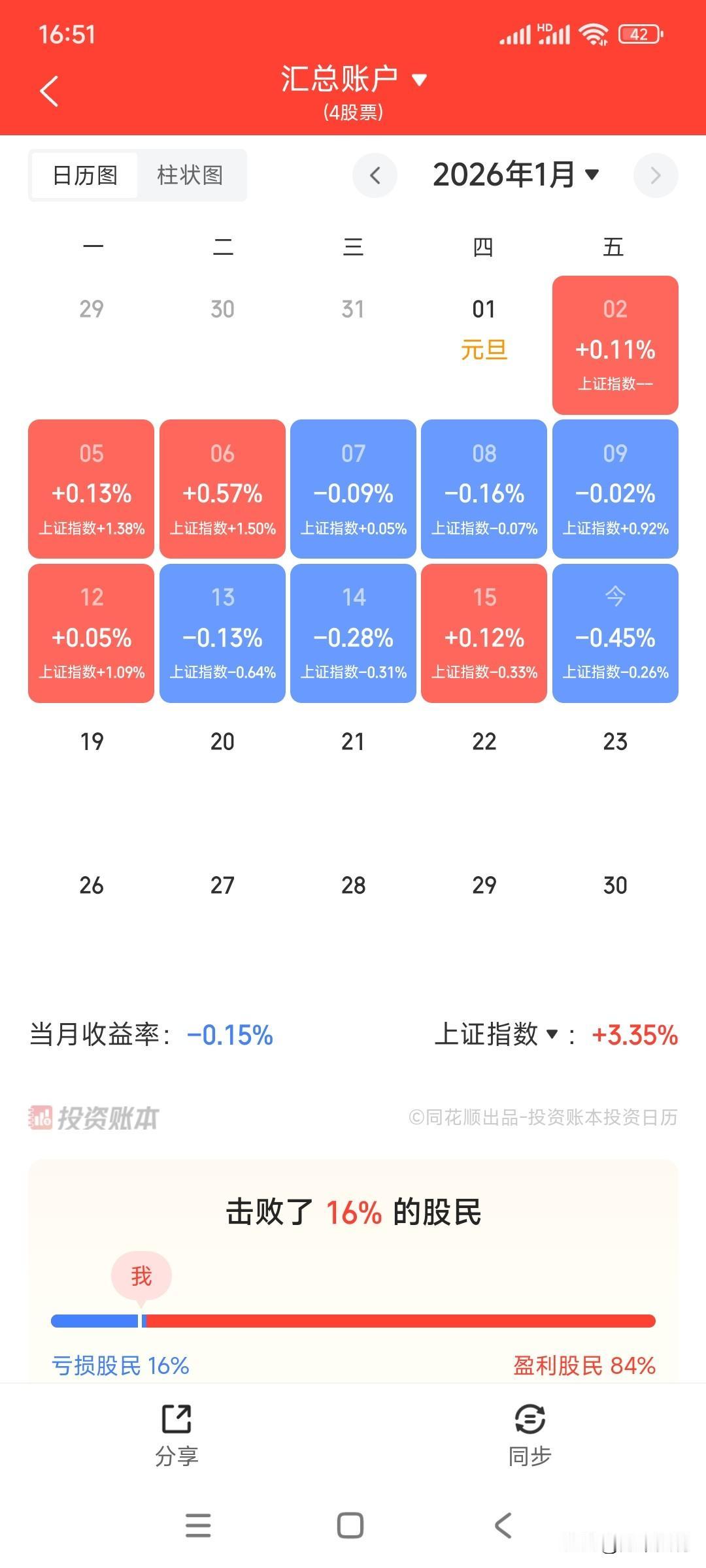 左侧交易就是要在下跌趋势中接飞刀,主动买套,因为谁也不知道能跌到什么价位,只要到了自己的建仓区,就可以慢慢拉开距离分批买入,这个可以看做是收集股权或筹码的一个过程。 今天又砸老登股,新年才开始大多持仓股都跌几个点了,我的现金仓位就是留到现在下跌中买入更便宜的股权,便宜才是王道。这点我可能与很多股友不同,我喜欢买下跌便宜的,很多股友喜欢买上涨趋势的,但我们都有一个共同点,就是各自认为自己的操作更具有安全边际,算是求同存异吧! 今天持仓股大多跌幅2%上下,今年收益由盈转亏,没想到今年才16%的股民亏损,妥妥的学渣啊!