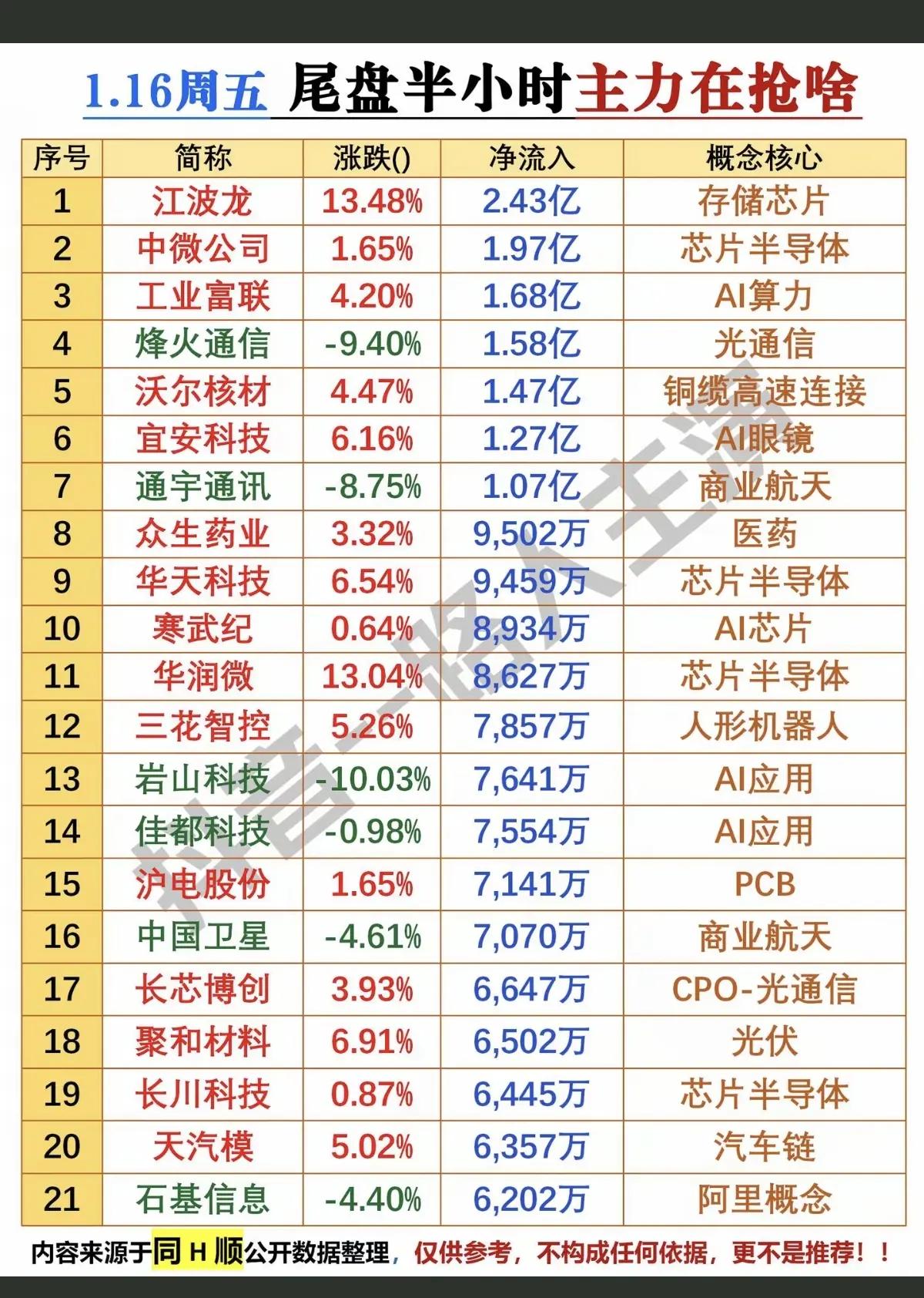 1月16,周五A股尾盘半小时主力抢筹一览表!!! 江波龙今日尾盘半小时主力大幅抢筹2.43亿,后市值得高看一眼;工业富联主力尾盘半小时大幅买入1.68亿,后市值得期待;沃尔核材主力尾盘半小时大幅买入1.47亿,后市值得重点关注!!!