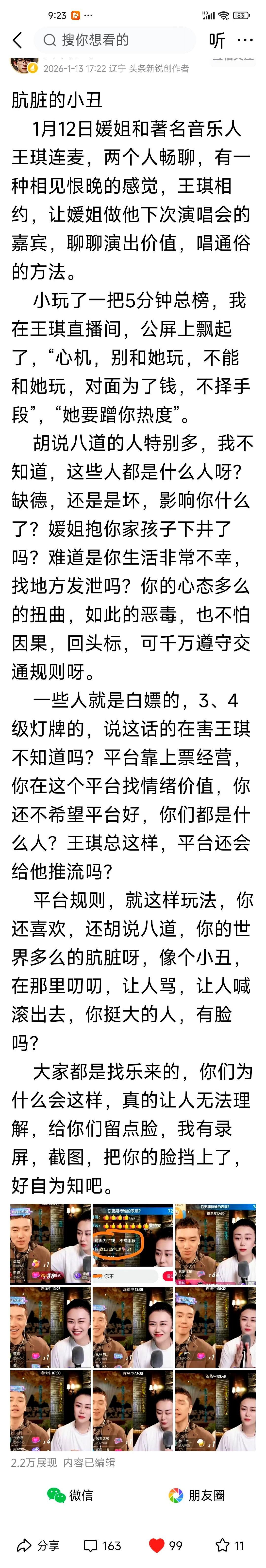 连麦被骂10万条,房管封不完 新号秒进,满屏重复句子。 嫄嫄只能赔笑,王琪那边礼物飞涨。 有人算过,一次互撕能让两边涨粉十万,平台抽成吃满。 平台新规已出:连麦出现辱骂,主播不立刻切断就算帮凶,轻则停播三天,重则七天。 去年抖音封了十万账号,快手永久关了几百个炫富号,可脚本换层皮又复活。 黑公关按条计费,一条五毛,一分钟能刷五百条。 观众以为自己在出气,其实帮人家完成了KPI。 屏幕里的怒火是别人提前写好的代码,点发送前就被安排好走向。 看直播时停三秒再敲键盘,想一想这怒气是不是自己本来的。 数据不会骗人,但会骗感情。
