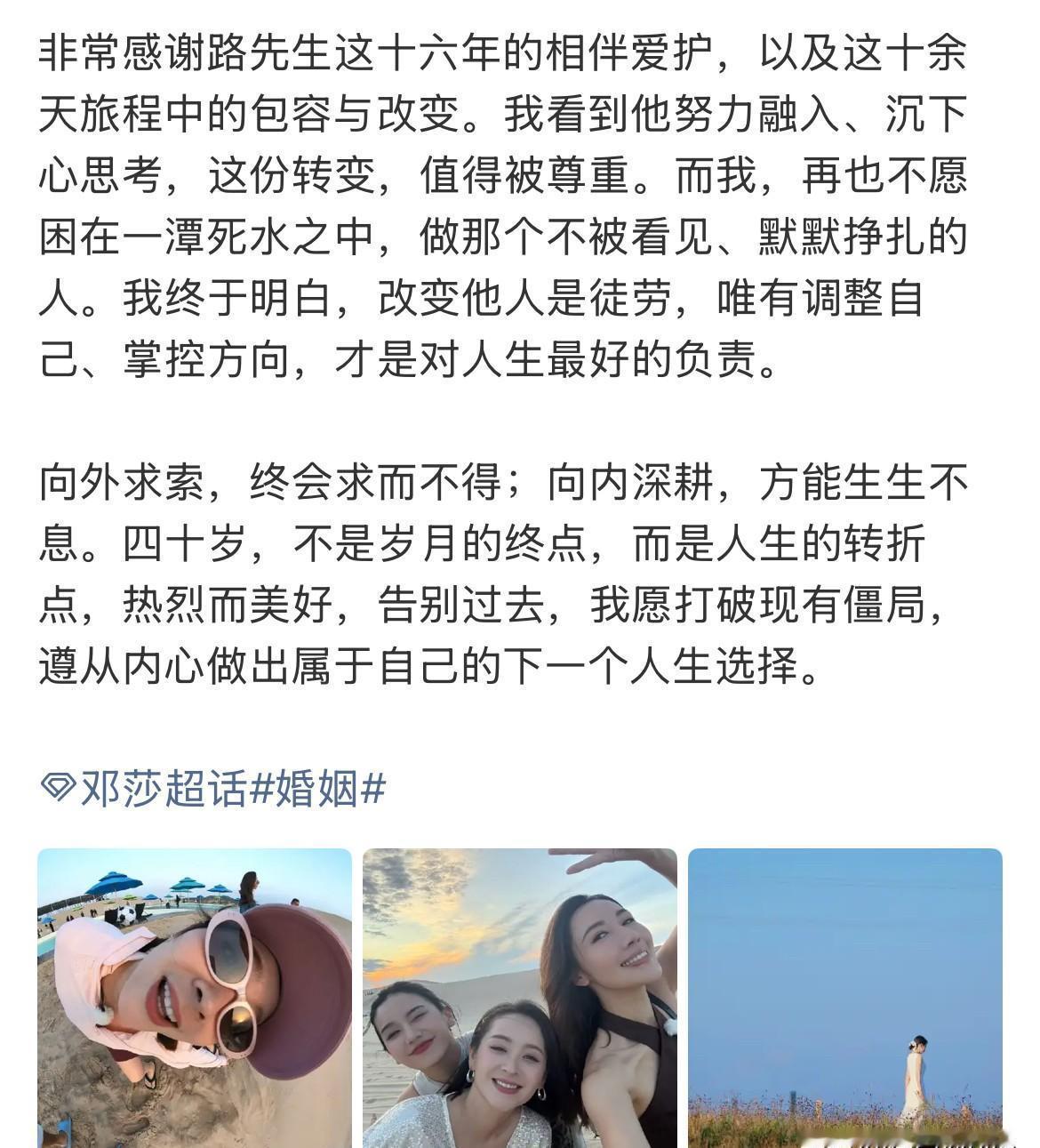 16年感情说散就散 邓莎刚官宣分手就进组拍戏了 昨天她发长文告别《再见爱人》 今天工作室声明全力支持她专注自我 网友翻出节目细节:爱与不爱早藏在眼神里 但最狠的是什么? 她转身就扎进了李现周雨彤的新剧《春色寄情人》 演重要配角 工作邀约突然暴增 这哪是情场失意 分明是事业要起飞的信号 感情里最清醒的转身 往往是把眼泪变成片场的汗水 你说呢?
