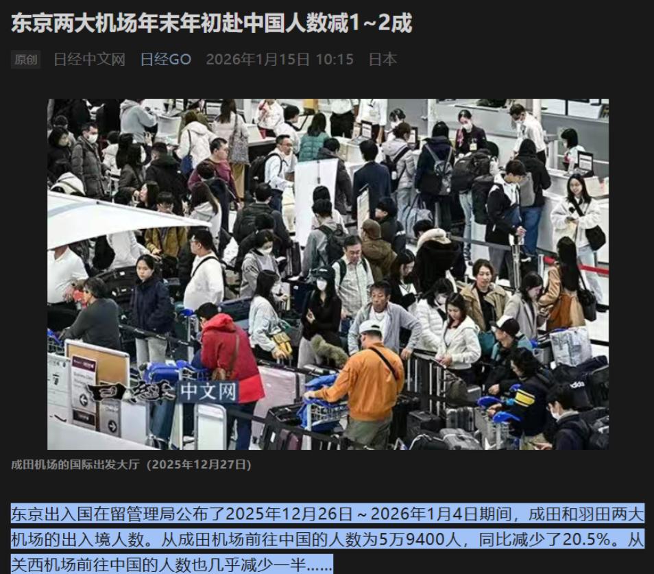 日本传来重磅消息 1 月 15 日,东京出入国在留管理局公布了 2025 年 12 月 26 日~2026 年 1 月 4 日期间,成田和羽田两大机场的出入境人数。从成田机场前往中国的人数为 5 万 9400 人,同比减少了 20.5%。从关西机场前往中国的人数也几乎减少一半。 这组数据一出来,日本旅游圈直接炸了锅,毕竟往年这会儿,成田机场的中文播报比日语还密集,关西机场的免税店导购都得练着用东北话推销化妆品,现在倒好,值机柜台前稀稀拉拉,连专门为中国游客准备的微信支付海报都蒙上了一层灰。 有经常往返中日的商务人士拍了张成田机场的照片,往日排着长队的中国签证办理区空荡荡的,只有几个工作人员在闲聊,配文 “三十年未有之冷清”,在社交平台上刷了屏。 最慌的当属日本旅游业的从业者。大阪观光局刚统计完,旗下 20 家会员酒店里,50% 到 70% 的中国游客订单都黄了,有的酒店甚至把已经备好的年夜饭套餐都退了食材。 关东镰仓市的土特产商店更惨,之前中国游客占比超一半,现在店里门可罗雀,老板对着满货架的抹茶饼干叹气,说再这样下去只能考虑关店。 东日本国际旅行社的社长更无奈,去年 12 月起,所有中国的修学团、交流团订单全取消,就算客户付了定金也宁愿赔违约金,今年 1 月更是连咨询电话都没响过几声。 零售业的日子也不好过。三越伊势丹、高岛屋这些老牌百货店,去年 12 月的免税销售额同比跌得厉害,三越伊势丹直接下滑 20%,高岛屋面向中国游客的销售额更是降了 35%。 银座商圈里,之前忙得脚不沾地的中文导购,现在只能扎堆聊天,有的甚至开始自学韩语,想着能不能接住转道而来的韩国游客。 专门接待中国游客的巴士公司,已经重现了 “无薪休假” 的情况,司机师傅们闲着没事,只能在停车场里擦车打发时间。 这股冷清劲儿还蔓延到了航班上。关西机场株式会社预测,今年 1 到 3 月,中日之间的航班要平均减少 28%,不少航空公司已经悄悄调整了航线,把原本飞东京、大阪的运力转到了首尔、曼谷。 有网友翻出去年同期的机票预订记录,那会儿春节前的中日航班几乎全价还一票难求,现在不少航班的折扣票都卖不完,航空公司的客服电话都快被退改签的咨询打爆了。 反观周边国家,倒是借着这股劲儿赚得盆满钵满。韩国明洞的商店赶紧换上了中文招牌,增加了微信、支付宝的支付渠道,首尔的滑雪场更是推出了 “原赴日游客专属套餐”,咨询量暴涨。 泰国也没闲着,新增了重庆、天津到曼谷的航线,芭提雅的酒店推出了春节特惠,不少原本打算去日本看雪的中国游客,转头订了去普吉岛的机票。 新加坡的在线旅行社更机灵,直接针对取消日本行程的游客推出了 “新马泰联游” 立减活动,订单量蹭蹭往上涨。 日本网友的反应也挺有意思,有人在论坛上吐槽 “高市首相一句话,把中国游客都吓跑了”,还有人晒出自己常去的中华料理店,说以前要排队,现在随时能找到座位。 更有日本民众直接去首相官邸前抗议,要求撤回涉台错误言论,毕竟旅游、零售这些行业关系着不少人的饭碗。 连日本经团联的大佬们都坐不住了,在新年年会上频频表达焦虑,生怕中日关系恶化影响生意。 其实这场景放在几年前根本不敢想,早年间中国游客赴日 “爆买” 的盛况还历历在目,新宿、秋叶原被挤得水泄不通,日语里都冒出了 “爆买” 这个新词。 那会儿日本商家恨不得把 “喜迎中国游客” 的招牌挂到机场出口,微信支付、中文导购都是标配,现在倒好,风向一转,轮到他们对着空荡荡的店铺发愁。 有意思的是,这波赴华人数减少,还连带影响了日本的服务行业。不少专门做中日跨境业务的翻译、导游没了活计,只能临时转行做国内旅游。 还有之前主打 “中日周末游” 的旅行社,现在只能把线路改成 “日本本州深度游”,试图挽回一些本地客源,但效果并不理想。 说到底,旅游和民间交流就像一面镜子,反映着两国关系的温度。之前热热闹闹的双向奔赴,现在因为一些不当言论变得冷冷清清,最受伤的还是普通民众和靠生计吃饭的从业者。 看着周边国家忙着抢客,日本旅游业却在原地发愁,不知道那些喊着 “参战” 的政客们,会不会心疼这些流失的客源和真金白银。