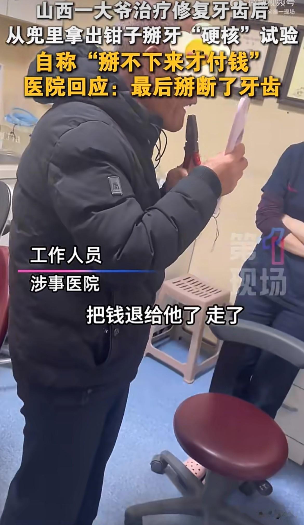 大爷手一伸,从棉袄兜里掏出来的不是钱,是一把明晃晃的钳子。 他对着牙科医生,话说得梆硬:“掰不下来,我才付钱。” 这是1月15号,山西太原一家牙科医院里实实在在发生的事。就在前一天,这位大爷刚在这里做了树脂桩核的牙齿修复。谁知道过了一夜,他回来不是复查,而是“验收”。 医院的人当时都愣住了。他们眼看着大爷把钳子伸进自己嘴里,对着那颗新修的牙,使劲一掰。 “咔吧。” 一声挺脆的响声。然后,大爷手里捏着钳子,没说话,但那意思再明白不过:你看,断了。 医院的工作人员后来回忆,大爷当时坚持认为他们做的牙“不结实”,所以必须用这把钳子当“质检工具”。这场面,任谁看了都得说一句离谱。工作人员也挺委屈,直说:“没见过这种人。” 可结果呢?医院还是把钱退给了大爷,让他走了。一场看似荒诞的“硬度测试”,以大爷的“成功”和医院的退款告终。 这事光听着就让人觉得牙根一酸。你想想,树脂桩核是什么?它像一根打进牙根里的“小钉子”,上面才能接牙冠。它的牢固,靠的是精密粘接和生物力学设计,是让它能在嘴里经年累月地咀嚼食物,不是用来和钢铁钳子比谁硬的。 大爷这验收标准,定得就跟用锤子检验刚抹好的水泥墙一样,墙皮准得掉。他把修牙这事儿,彻底理解成了买板凳——坐不塌才算好。可人身体里的东西,哪能这么算? 普通人看完,心里头想法可就多了。 有人说,这大爷是“狠人”,对自己真下得去手。也有人说,医院最后选择息事宁人退款,也是没办法,碰上这么一位,讲不通道理,难道还在诊室里一直耗着?耽误其他病人不说,再闹出点别的事,更麻烦。 更多人觉得,这里头透着一股子说不出的别扭。你说大爷完全不讲理吧,他好像又有那么点自己认准的“道理”。可这道理,和医学、和常识,完全不沾边。它更像是一种极度的、甚至有点偏执的不信任。他可能觉得,不这么“硬核”地试一下,心里就不踏实,就怕吃亏。 这把钳子,掰断的不仅仅是一小段树脂材料。它更像是一下子杵在了医患之间那层本来就挺薄的信任窗户纸上。 医生觉得委屈,专业和技术被一把钳子全盘否定。而大爷那边,或许觉得自己用最直接的方式维护了权益。这件事没有赢家。医院损失了材料和精力,大爷呢,他得到退款的同时,那颗需要治疗的牙,问题依旧还在那里,而且可能更复杂了。 以后他再去别的医院,这事儿万一传开了,医生给他治牙时,心里会不会多一层顾虑?这谁也说不准。 一场由一把钳子引发的“验收”闹剧,留下的是一地鸡毛和一堆问号。它比一个简单的笑话要沉重那么一点。