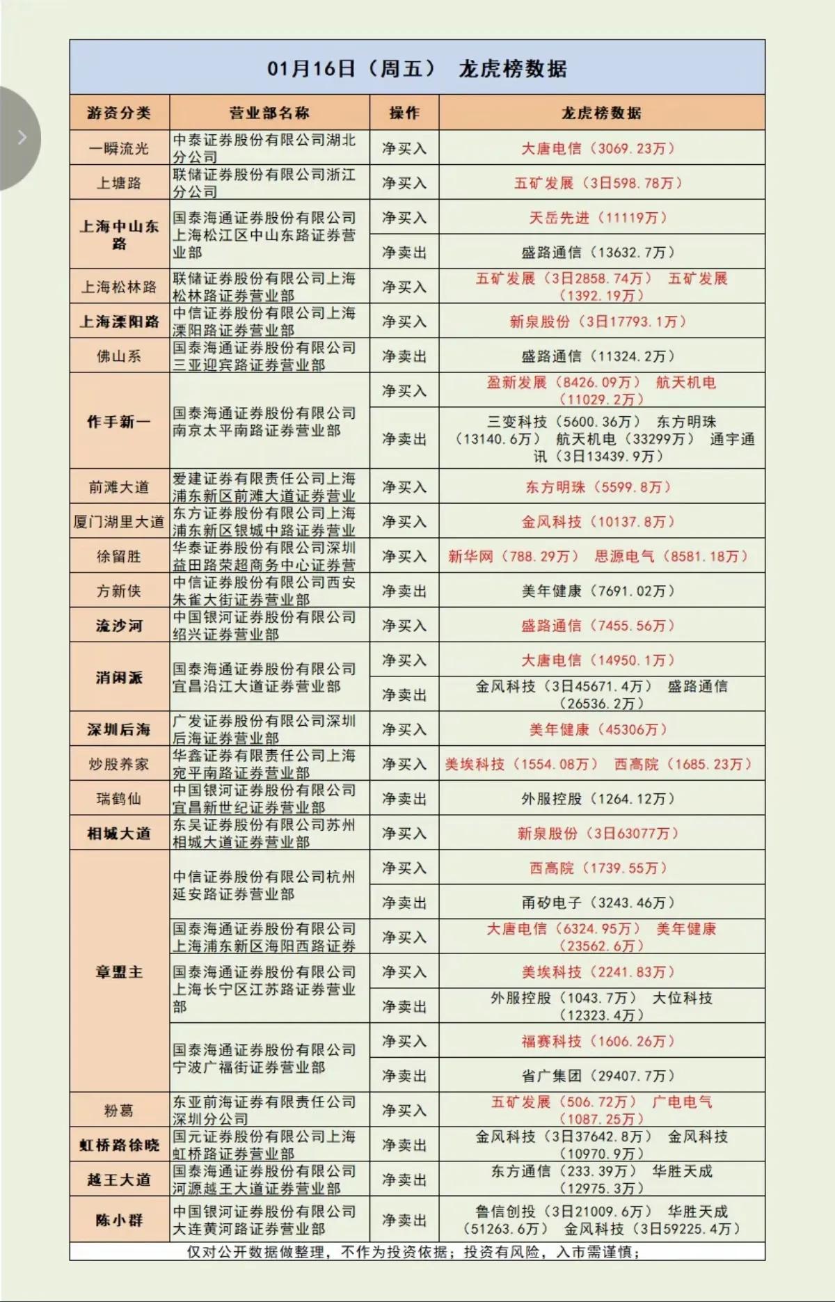 1月16日,周五A股大柚子买了啥!!! 群总3日卖出鲁信创投2.1亿、华胜天成5.1亿、金风科技3日5.9亿;相城大道3日买入新泉股份6.3亿;作手新一买入盈新发展8426万、航天发展1.1亿、卖出三变科技5600万、航天机电3.33亿!!!