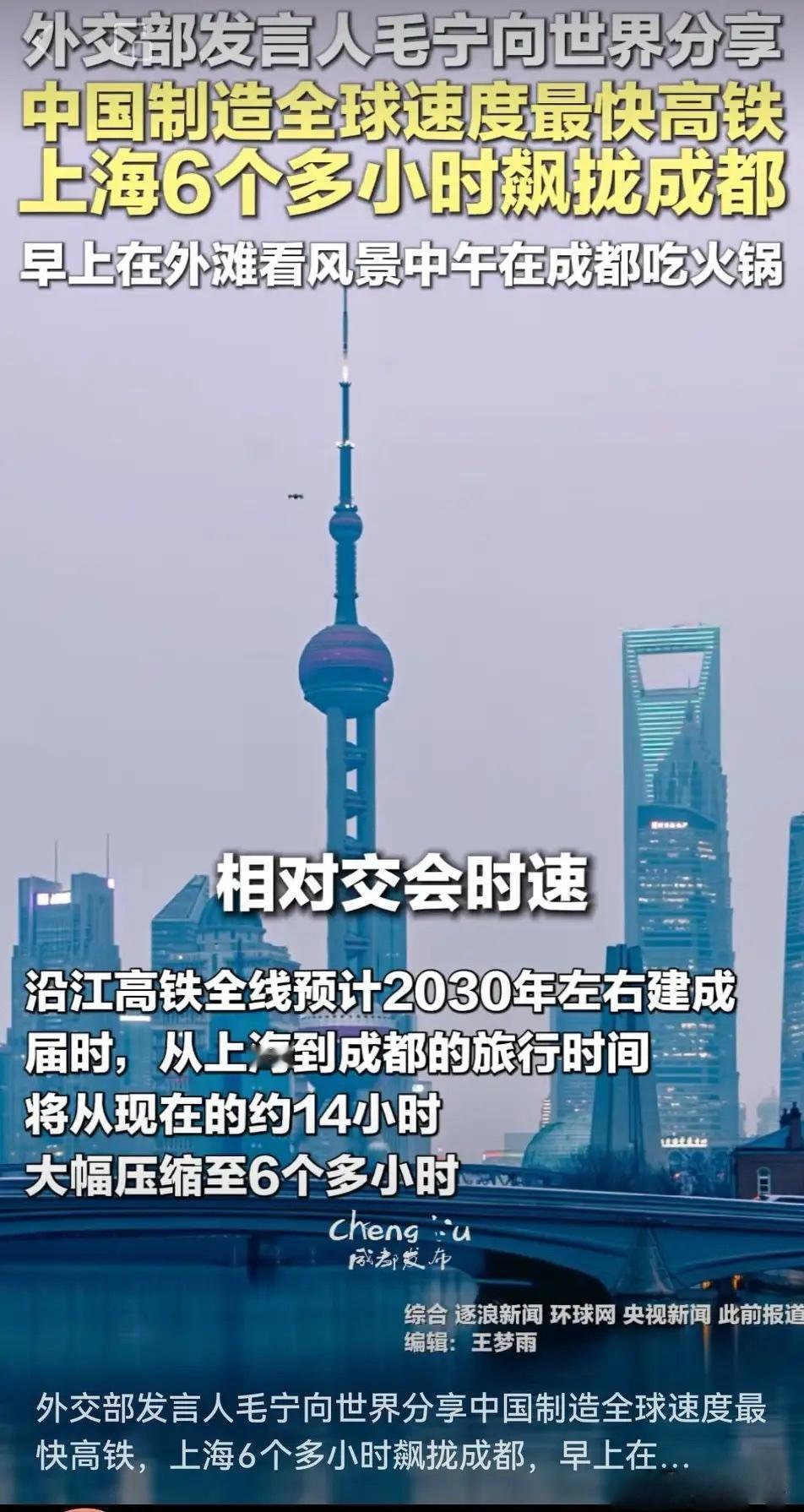早上外滩看风景,中午成都吃火锅。 外交部发言人毛宁向世界分享中国高铁,称上海出发6小时飙到成都,这不仅推介了中国速度,更给成都火锅打了广告。 新闻发言人的分量是很重的,一出口,各大媒体都会跟进发声。看来,成都火锅真不需要自己去吹嘘,名气在那儿摆着的,不管是外交官,还是外国政要,更或是全国各地的游客,都知道到成都吃火锅、看熊猫。