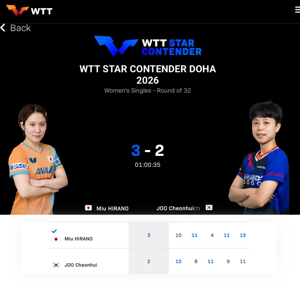 WTT球星挑战赛多哈站女单1/16决赛朱芊曦🇰🇷2比3平野美宇🇯🇵[10