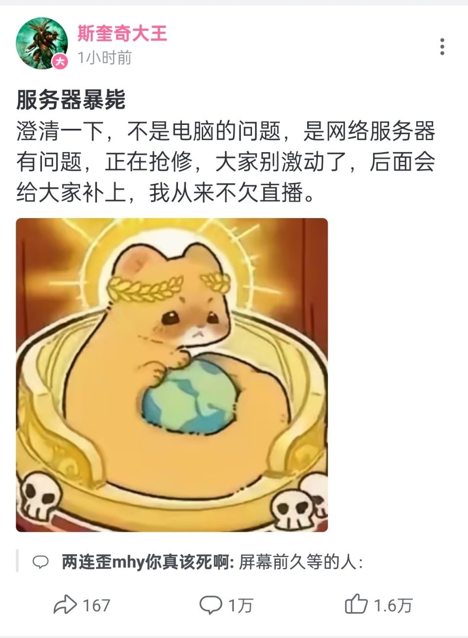 牢A直播牢a直播热度太高了,服务器有问题,今晚的直播没有了,后面会补上。