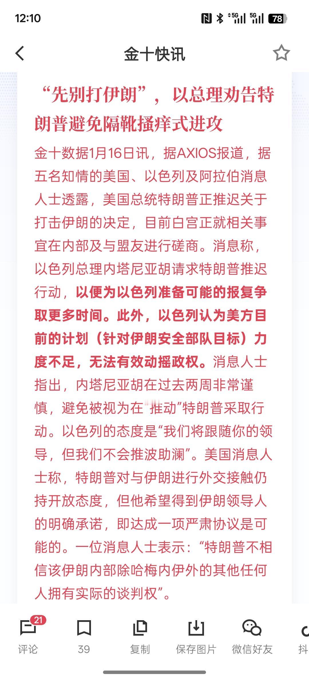 “先别打伊朗”,以总理劝告特朗普避免隔靴搔痒式进攻,美国方面现在也停止类似的动作!暂时不对伊朗发动袭击 伊朗与中国也在通话沟通,通报了相关情况!但美国的动作依然不断,有航母开往中东地区最终会是什么样的结果?看接下来的一段时间里,美国会有什么样的动作? 伊朗国内也在做准备,各方面也是战备状态,而且武器装备包括导弹也都已经部署!如果美国对伊朗发动袭击,伊朗首先就要攻击美国在中东地区的军事基地!