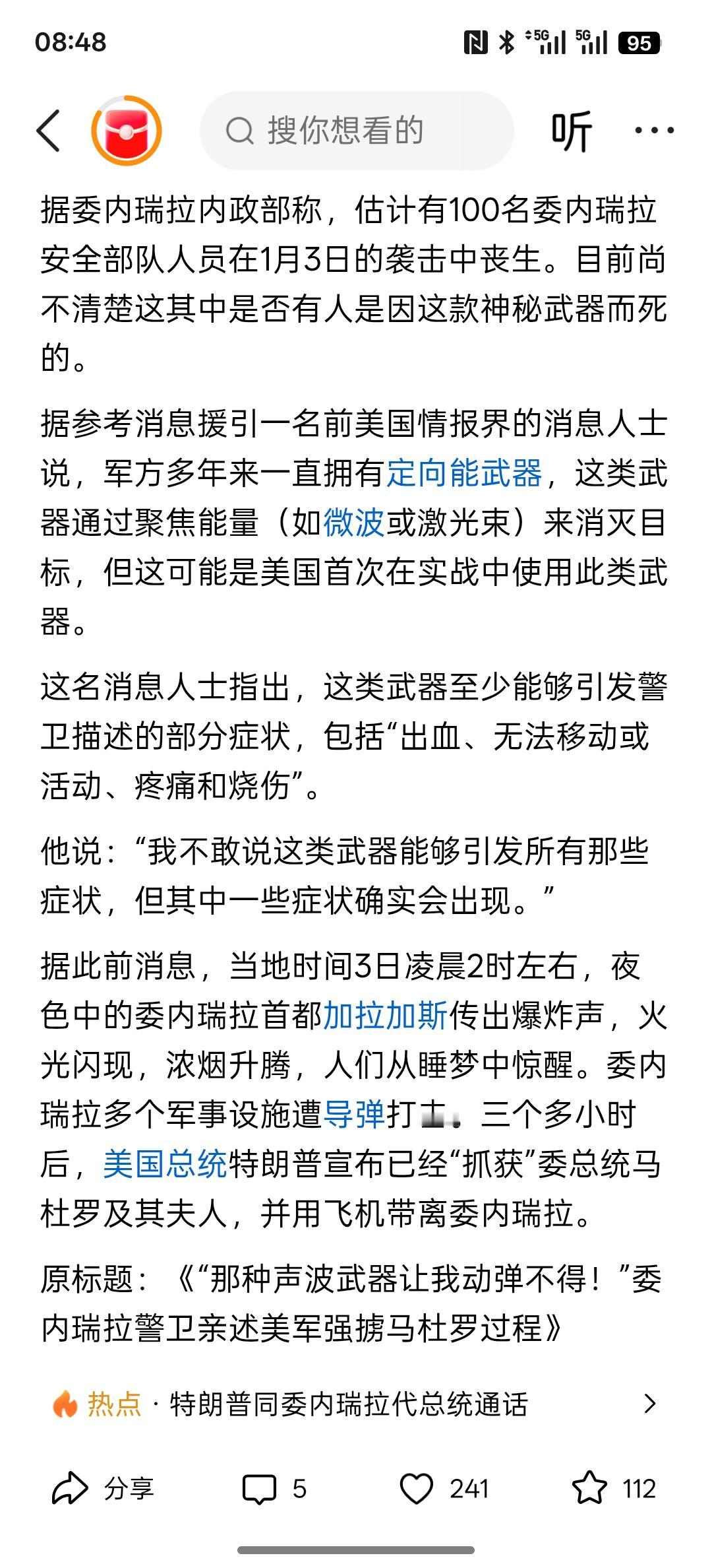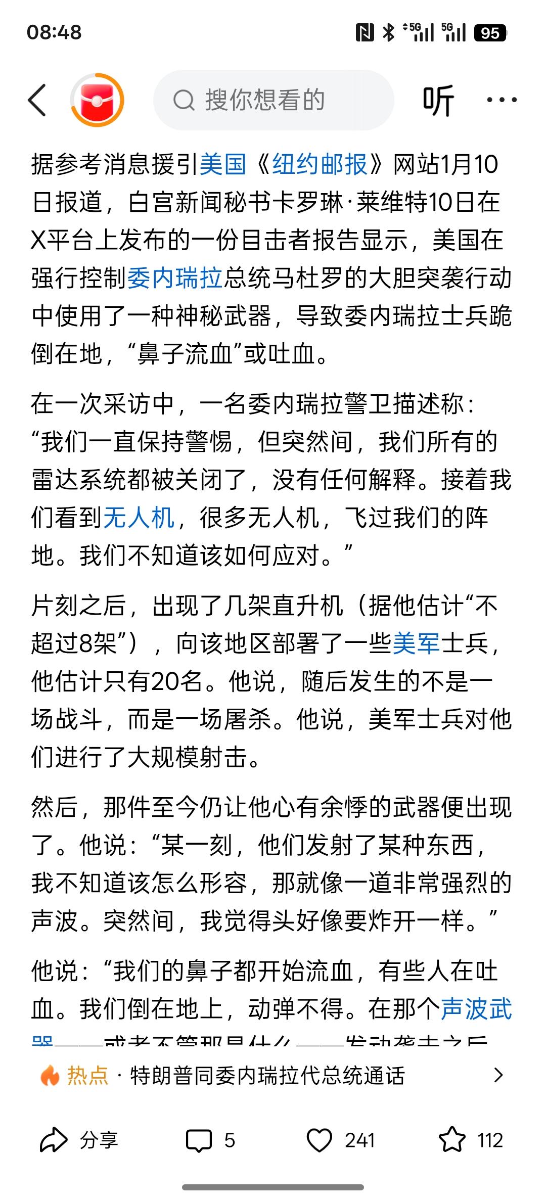 “那种声波武器让我动弹不得!”委内瑞拉警卫亲述美军强掳马杜罗过程! 其实美国经常指责别人用一些违禁的事情,但是往往都是美国自己在开始用!关于抓捕马杜罗,美国用的就是不一样的攻击方式! 现在马杜罗在美国被美国法律审判!但他依然很聪明,拒不认罪,保持非常沉稳!最遗憾的就是被身边最亲信的人出卖!