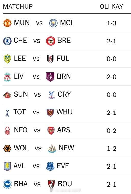 The Athleti记者Oliver Kay预测本轮英超:曼联1-3曼城切尔西2-1布伦特福德利物浦2-0伯恩利热刺2-1西汉姆诺丁汉森林0-2阿森纳 英超联赛 阿森纳著名教授