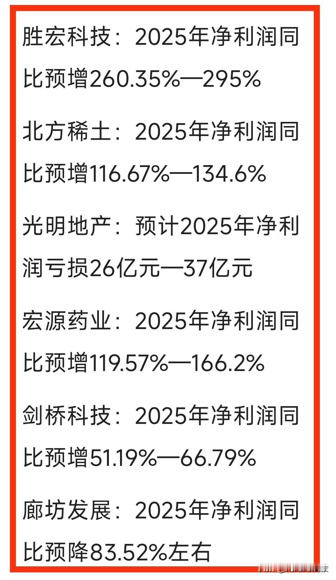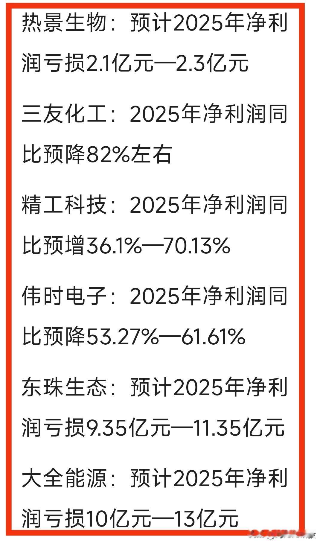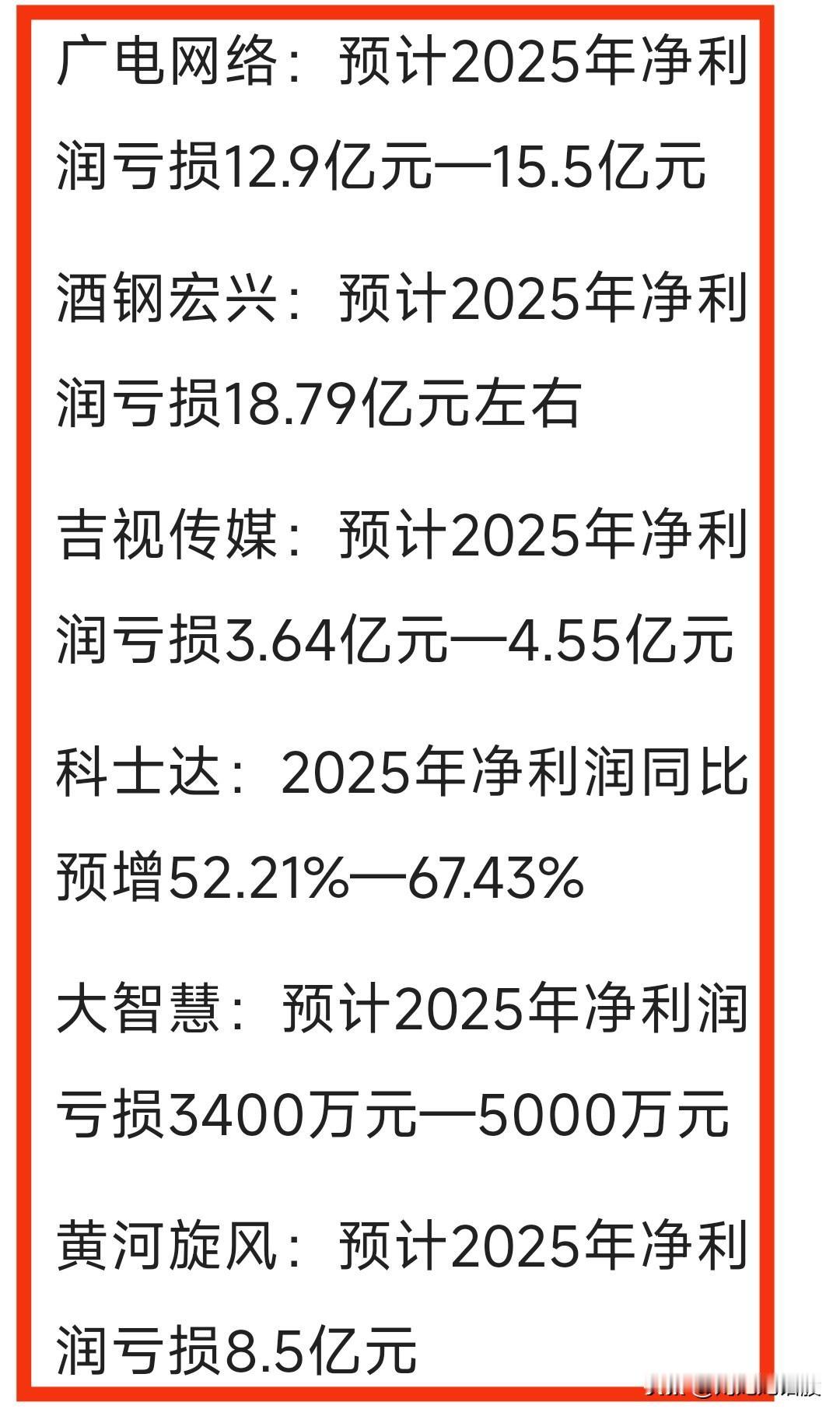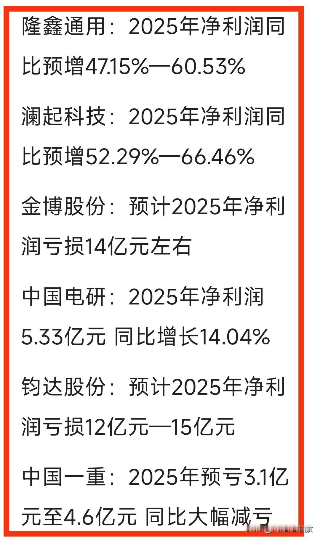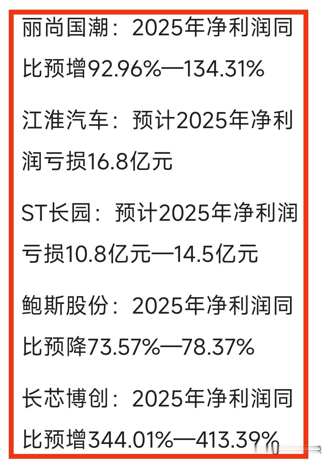周末2025“年度业绩”预告-汇总。大幅预增公司不少,但大幅亏损公司数不胜数,比如“江淮汽车”、“东珠生态”、“大全能源”等预计大幅亏损…… 关注“刘姥姥”,精彩分享真不少(麻烦亲们:点赞,收藏,分享)。 特别提醒:本文涉及内。容及个股,仅供交流与参考,不是荐股,不得以此作为买卖依据,盈亏自负。业绩预告 年度业绩预告