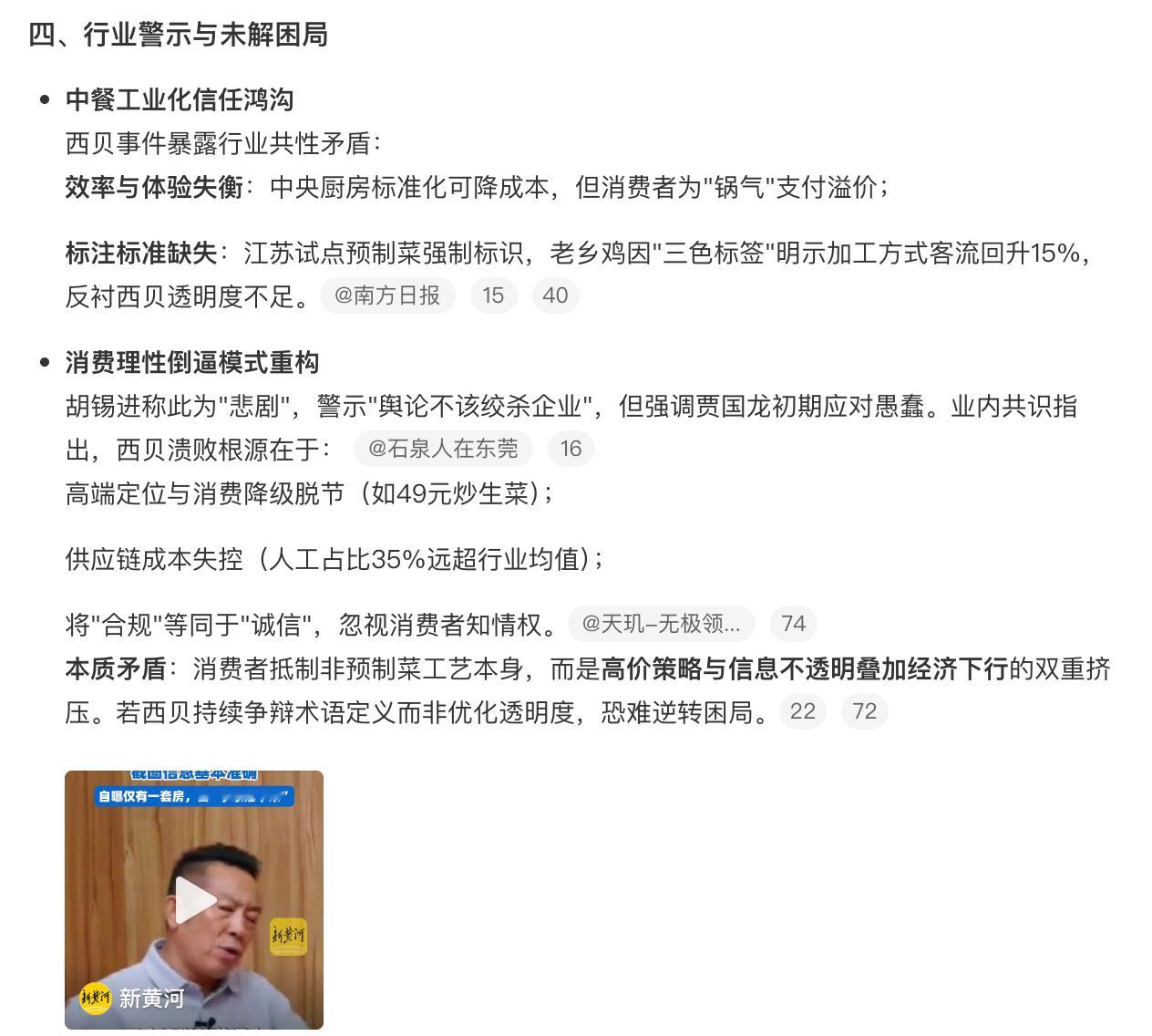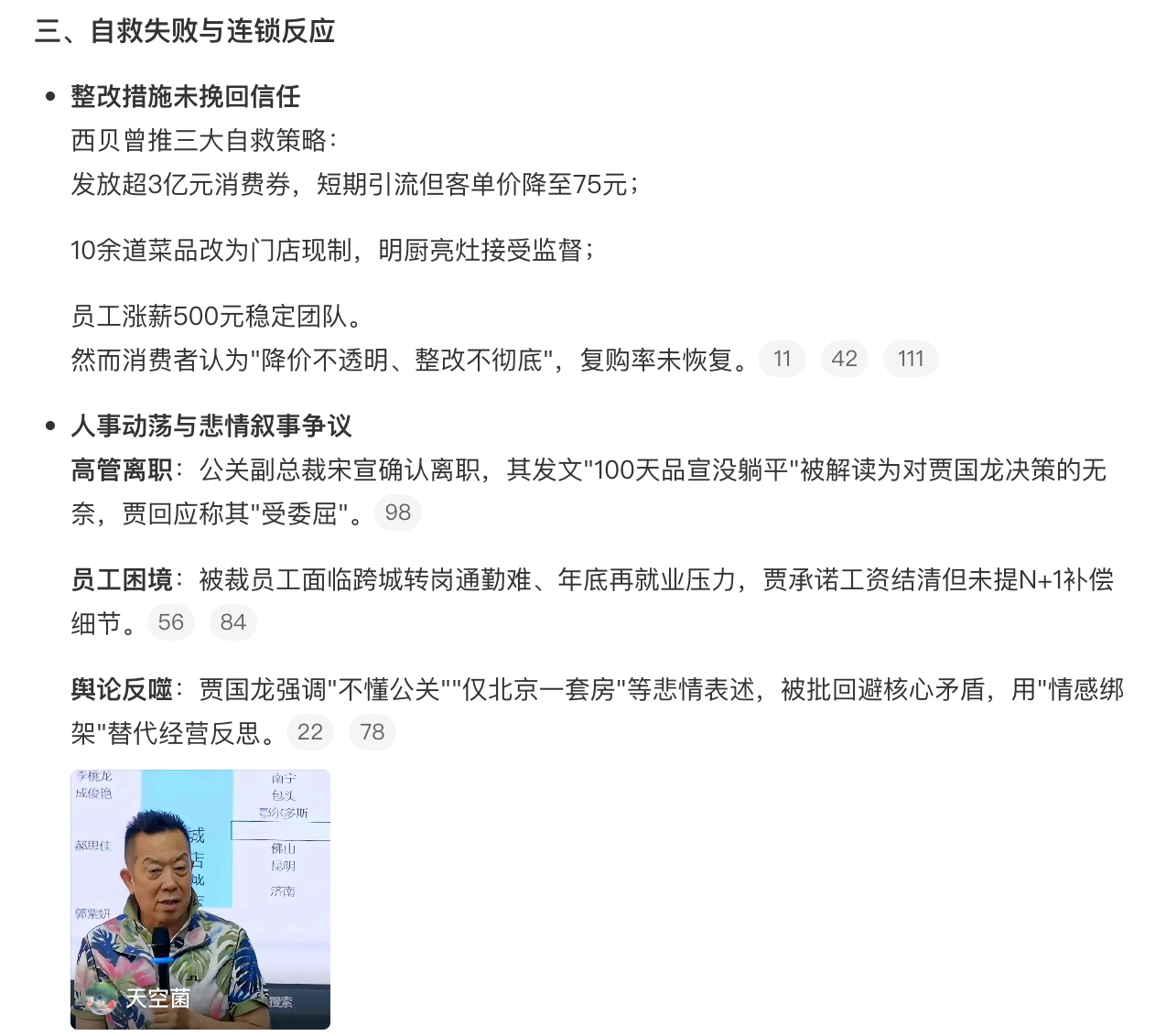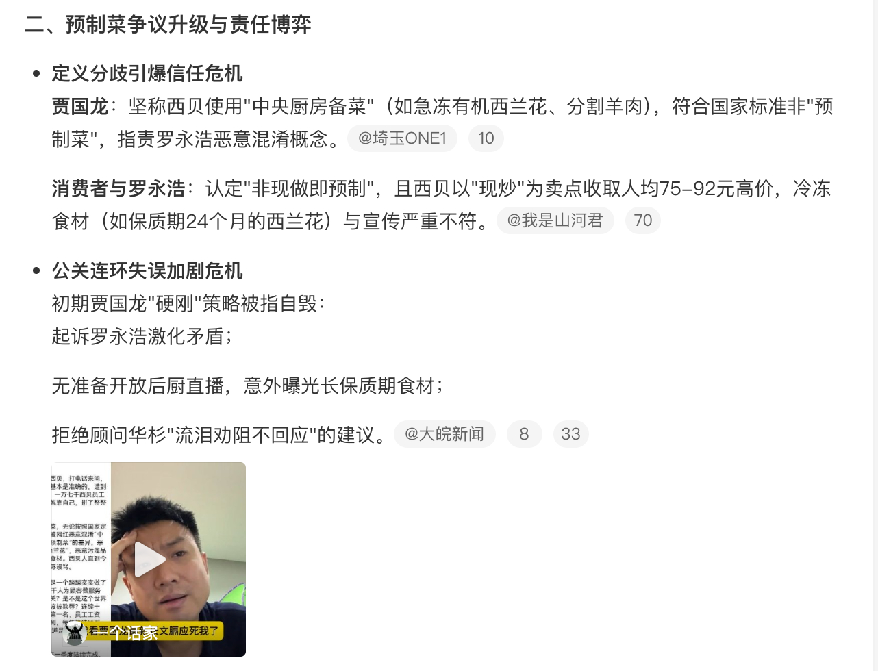 西贝风波后续 这事怎么又燃起来了? 首先可以断定这一次是有公关行为的西贝是有备而来的,我不信一个经营全国100多家连锁门店的餐饮大佬连基本的敏感度都没有。来势汹汹,炮轰老罗一股誓不罢休的样子问题来了,他和老罗谁能笑到最后呢感觉,最后很可能一个和局