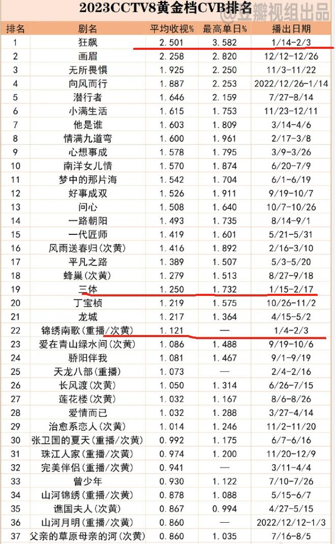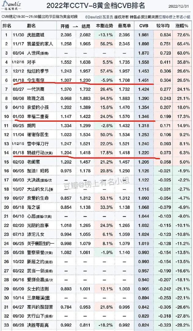 《小城大事》收视率微微上涨! 之前就说过了,央八的开年并不是好档期,近五年,除了2023年的大爆剧《狂飙》之外,其他一月份在央八播的剧,收视率几乎都是全年最低糜的,大部分剧的cvb收视率都在1.2%到1.5%之间,属于全年低收视率时段,《小城大事》应该是近五年央八一月份继《狂飙》之后,收视率最高的一部,但是《小城大事》的云合确实不行。