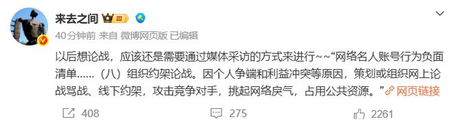 随后,新浪微博CEO王高飞通过个人微博@来去之间发布最新消息:以后想论战,应该还是需要通过媒体采访的方式来进行。