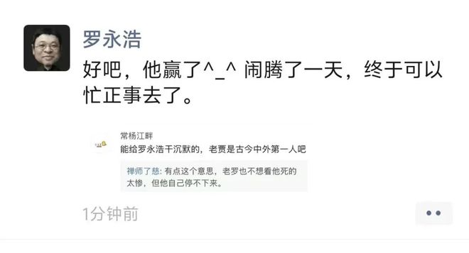 1月16日晚,在贾国龙发表相关公开信后,罗永浩在朋友圈最新发文,“好吧,他赢了。闹腾了一天,终于可以忙正事去了。”