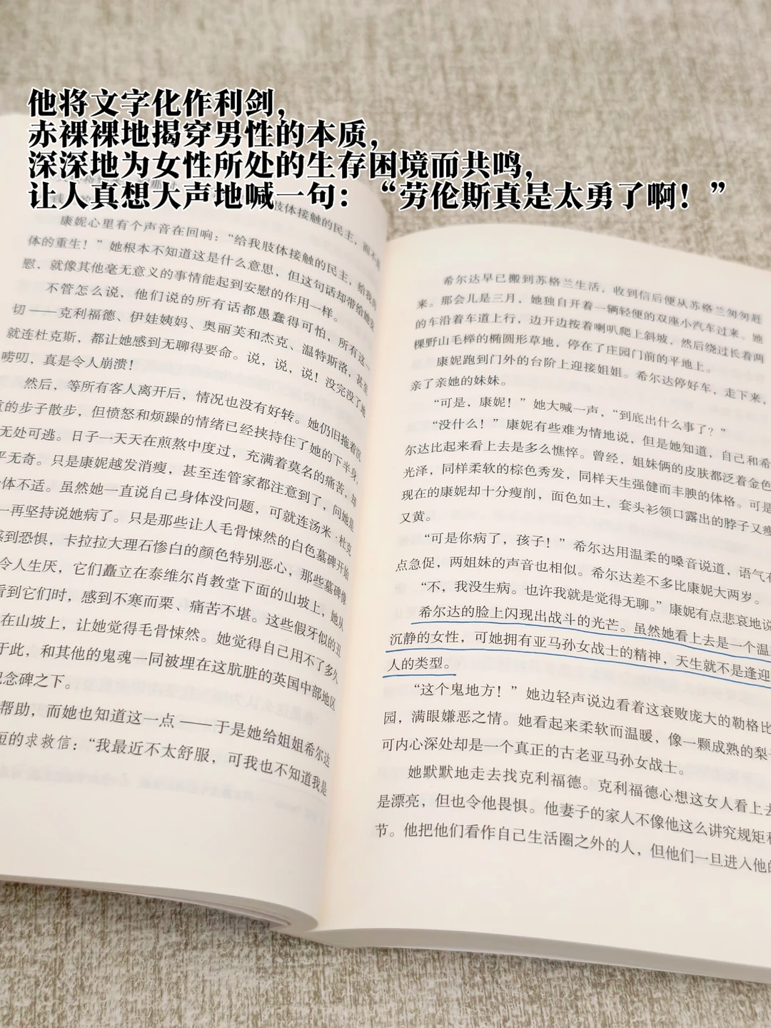 劳伦斯将文字化作利剑,赤裸裸地揭穿男性的本质,深深地为女性所处的生存困境而共鸣,让人真想大声地喊一句:“他真是太勇了啊!