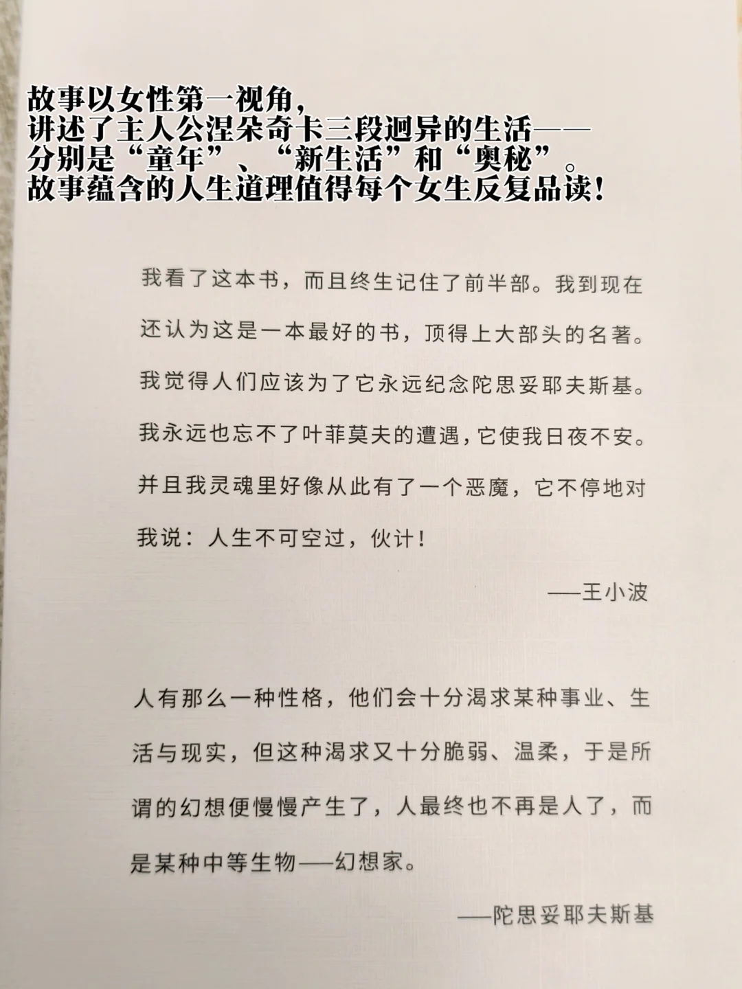 这是陀翁创作于早期的一部作品。故事以女性第一视角,讲述了主人公涅朵奇卡三段迥异的生活——分别是“童年”、“新生活”和“奥秘”。故事蕴含的人生道理值得每个女生反复品读!