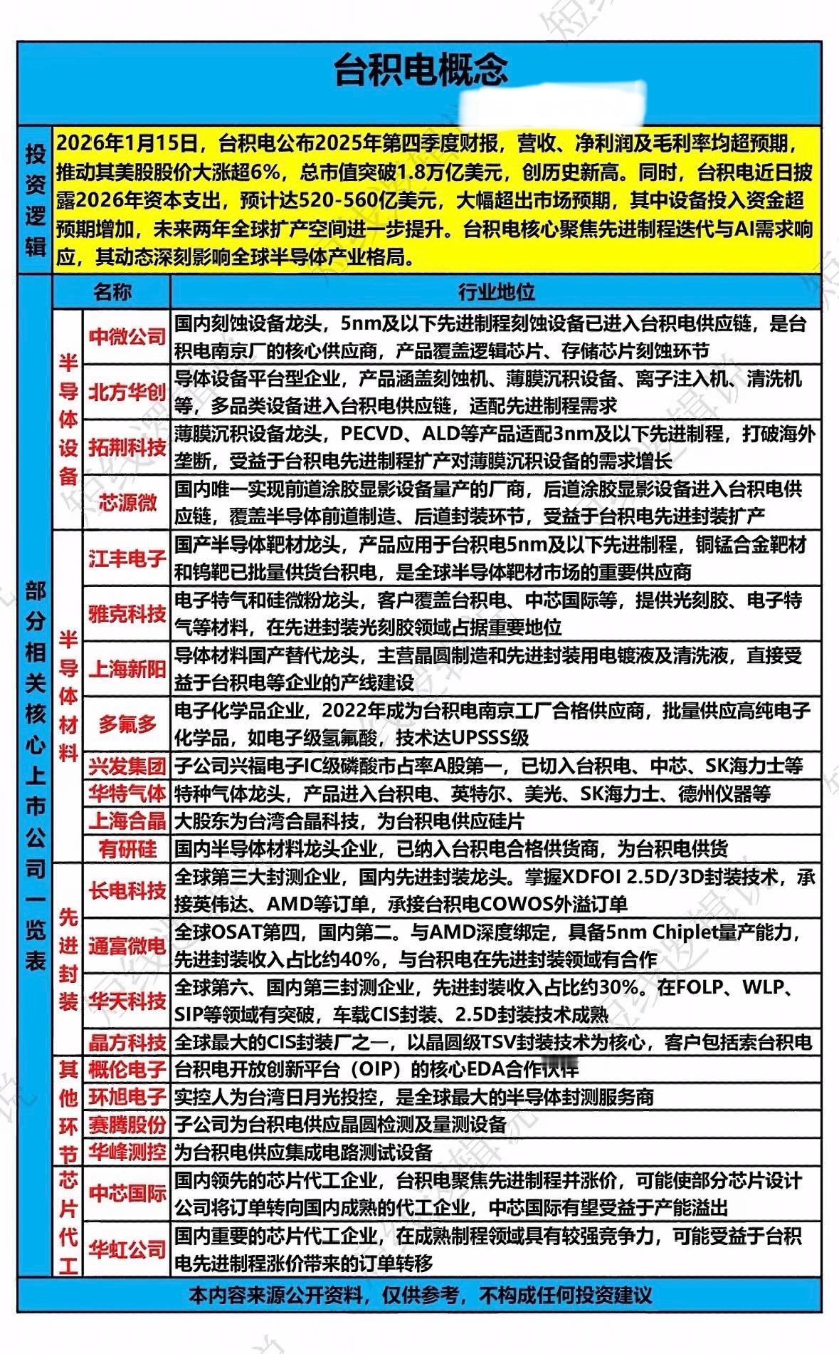 台积电业绩超预期,带动半导体产业链爆发,国产设备材料厂商加速崛起。 台积电财报超预期,股价创新高,先进制程扩产带动产业链发展,国产半导体设备材料厂商加速切入其供应链。