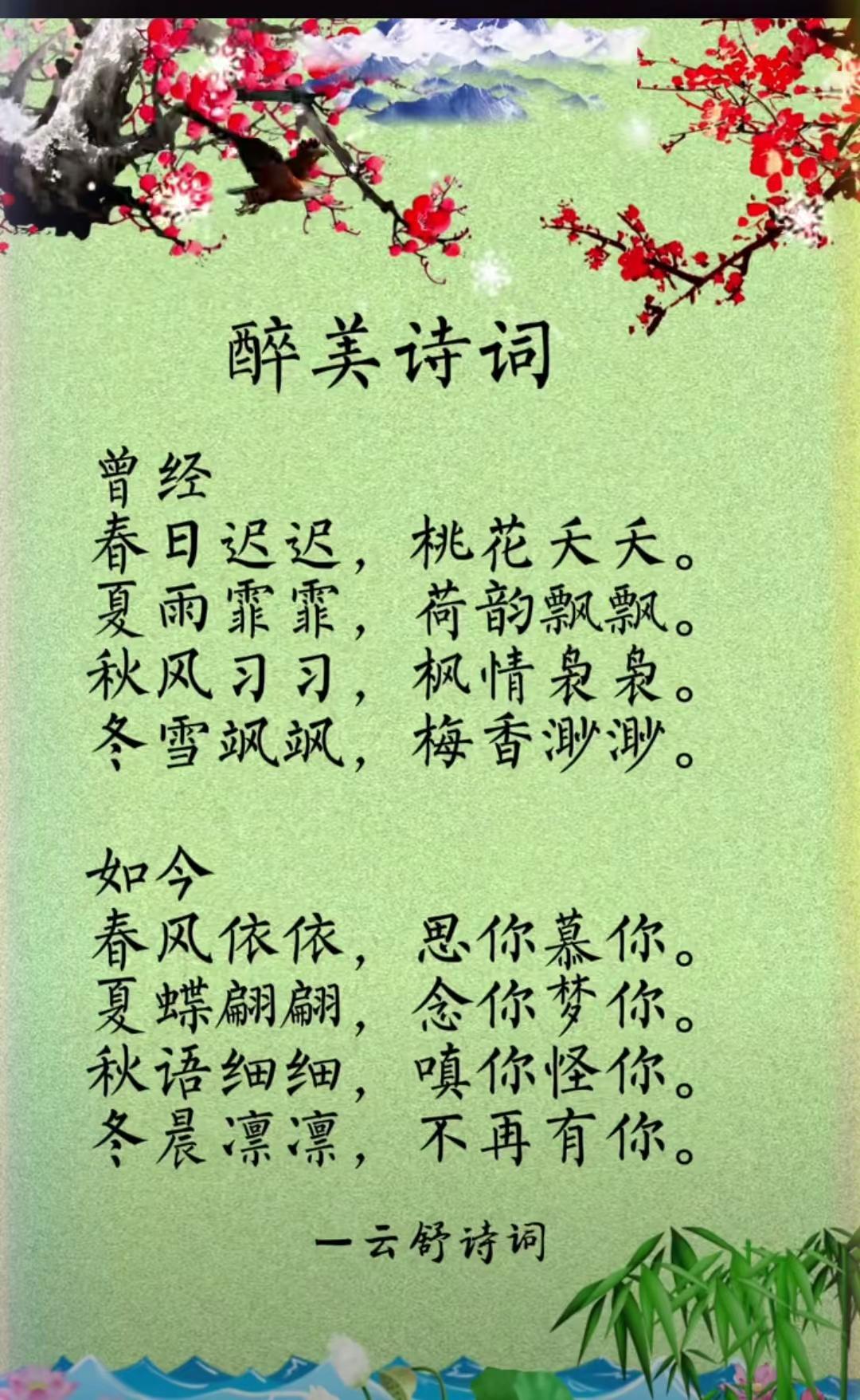 曾经:春日迟迟,桃花夭夭。夏雨霏霏,荷韵飘飘。秋风习习,枫情枭枭。冬雪飒飒,梅香渺渺。如今:春风依依,思你慕你。夏蝶翩翩,念你梦你。秋雨细细,嗔你怪你。冬晨凛凛,不再有你。涨知识 情感 正能量 国学文化