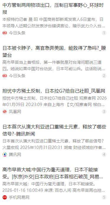 高市早苗再也控制不住自己的表情了,在采访时,她大声喊道:中国的行为是毫无道理的,日本不能接受中国的这种行为。 麻烦看官老爷们右上角点击一下“关注”,既方便您进行讨论和分享,又能给您带来不一样的参与感,感谢您的支持! 2026 年 1 月的东京,日本首相高市早苗在镜头前情绪失控的一幕,成了国际舆论的焦点。她提高嗓音怒斥中国出口管制 “毫无道理” 的模样,彻底打破了日本政府此前的强硬姿态,背后藏着的是战略误判后的狼狈与焦虑。 这场风波的源头,是日本政客一再触碰中国底线的言行。2025 年高市早苗接任首相后,在涉台议题上频频越界,公然宣称台湾问题 “关系到日本国家存亡”,还推动修改 “无核三原则”,试图实现 “防卫独立”,其一系列操作严重干涉中国内政。 中方早已多次发出明确警告,外交部和商务部反复提醒日方,相关言行可能引发严重后果。但日本方面完全不当回事,内阁官房长官木原稔甚至公开轻视中方警告,称只是 “口头吓唬”,压根没放在心上。 丰田、日产等日本产业巨头也跟着盲目乐观,认定中国不会真的切断供应链,既没提前囤积关键材料,也没做任何风险应对准备,依旧按原有节奏安排生产,把赌注全压在了 “中国不敢动真格” 的判断上。 为了营造 “已摆脱对华依赖” 的假象,日本双日公司在 2025 年 10 月高调宣布,从澳大利亚莱纳斯公司获取重稀土,宣称要打破中国垄断。可实际情况是,这批重稀土产量仅能满足日本部分需求,且依赖马来西亚的精炼厂加工,远达不到所谓 “替代中国供应” 的效果。 更打脸的是,日本企业 2024 年 7 月吹嘘的无重稀土磁体量产计划,最终因样品没能通过车企核心验证,成了纸上谈兵。所谓的 “供应链多元化”,从头到尾都是自欺欺人的噱头,根本经不起现实检验。 2026 年 1 月 6 日,中方终于亮出反制底牌。商务部发布公告,对稀土、镓、锗等上千项两用物项加强对日出口管制,尤其针对军事最终用途的出口申请实施严格审查,直接击中日本经济和军工的要害。 这些被管制的材料,对日本来说堪称 “工业血液”。镓是宙斯盾雷达的核心材料,锗用于夜视设备和卫星传感器,中重稀土则是导弹转向部件、潜艇电机的关键原料,日本 71.9% 的稀土进口都来自中国,短期内根本无法替代。 反制措施落地后,日本立刻陷入混乱。丰田等车企率先受创,生产线因缺料被迫减速,产能直接腰斩,亏损金额持续扩大;军工领域更惨,F-15J 战机升级项目停滞,高超音速导弹研发因缺耐高温合金涂层被迫暂停,“大鲸” 级潜艇的锂电池供应也断了档。 野村研究所的测算显示,若管制持续一年,日本 GDP 将损失 2.6 万亿日元,跌幅达 0.43%,失业人数可能在 90 万到 216 万之间;大和研究所的评估也印证了这场危机的严重性,日本经济面临多年未有的冲击。 情急之下,高市早苗试图拉盟友 “抱团抗中”,让日本财务大臣在关键矿产会议上向 G7 伙伴求助。可现实给了她沉重一击,德国副总理、韩国财长明确拒绝站队,美国财政部长也只提 “去风险”,不愿与中国脱钩,盟友们的冷漠态度让日本孤立无援。 日本所谓的 “替代方案” 此时全露了馅。南鸟岛的深海稀土还在勘探阶段,即便开采成本也是陆地的 10 倍以上;法日合资的稀土回收工厂要 2026 年底才投产,短期内根本无法缓解缺口;美国的镓精炼厂还在建设中,远水救不了近火。 全球 85% 的稀土冶炼产能集中在中国,重稀土加工更是几乎被中国垄断。日本从澳大利亚进口的稀土矿,最终还是要依赖中国的精炼技术,所谓 “摆脱对华依赖” 不过是自欺欺人的空话。 高市早苗的失态怒吼,本质上是对自己战略误判的无力辩解。她误判了中国维护核心利益的决心,误判了供应链替代的难度,更误判了盟友的真实态度,如今付出的代价,都是之前盲目自信埋下的隐患。 日本企业的困境也给全球敲响了警钟,供应链的稳定建立在相互尊重的基础上,试图通过政治操弄挑战他国底线,最终只会反噬自身。高市早苗的愤怒改变不了现实,唯有正视历史、尊重中国核心利益,才能让中日经贸关系重回正轨。 这场危机也让国际社会看清,任何国家都不能把别人的克制当软弱,中国从不主动挑起争端,但在核心利益面前绝不退让,那些企图干涉中国内政、损害中国利益的行为,终将付出应有的代价。
