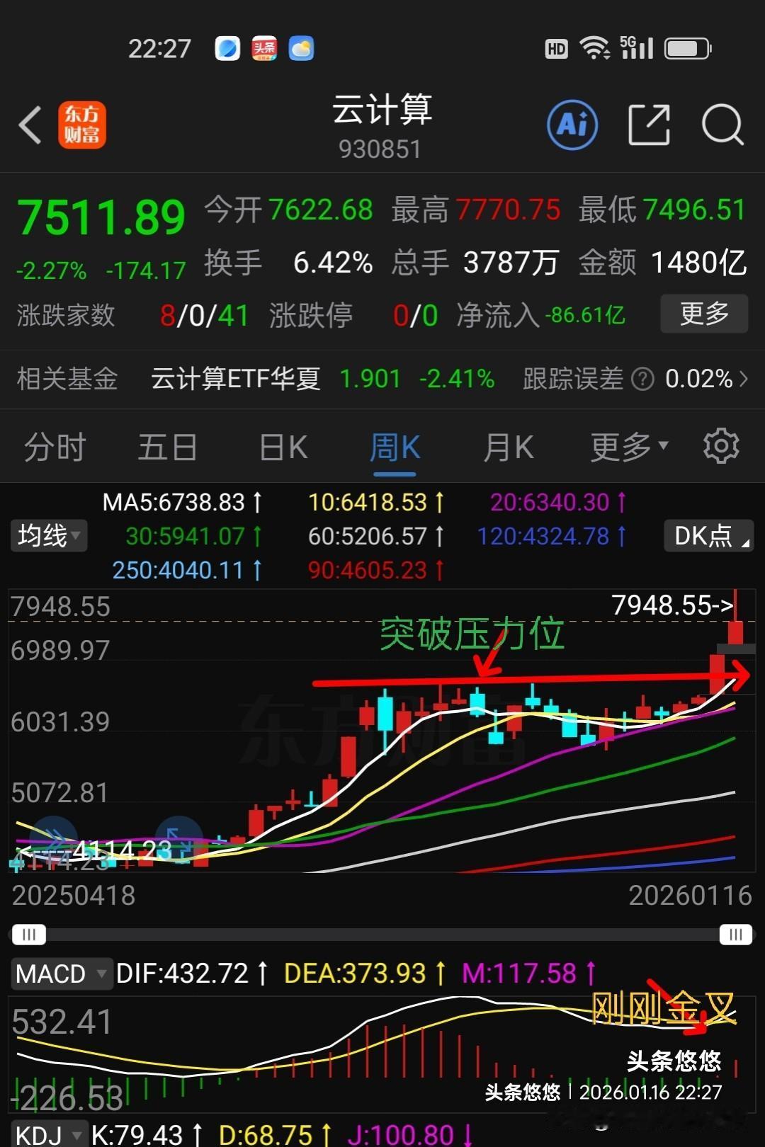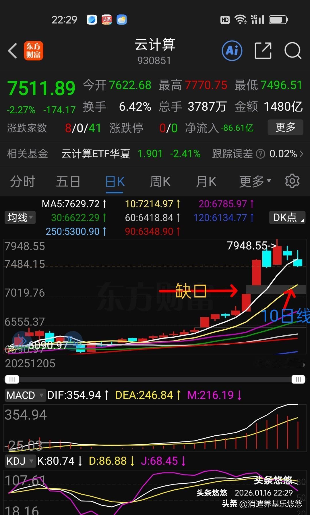 云计算下周趋势分析,下图是云计算日线及周线走势,日线头部迹象明显,已经跌破了5日线支撑,下周要回踩10日线支撑,大约还有4%下跌空间。回补跳空缺口还要下跌6%。 云计算周线已经形成上涨趋势,日线回调,不改中线上涨,同时,月线也是向上运行。所以说,云计算中长期可以继续持仓待涨,短线需要耐心等待止跌企稳。 点赞转发关注投资理财不迷路。