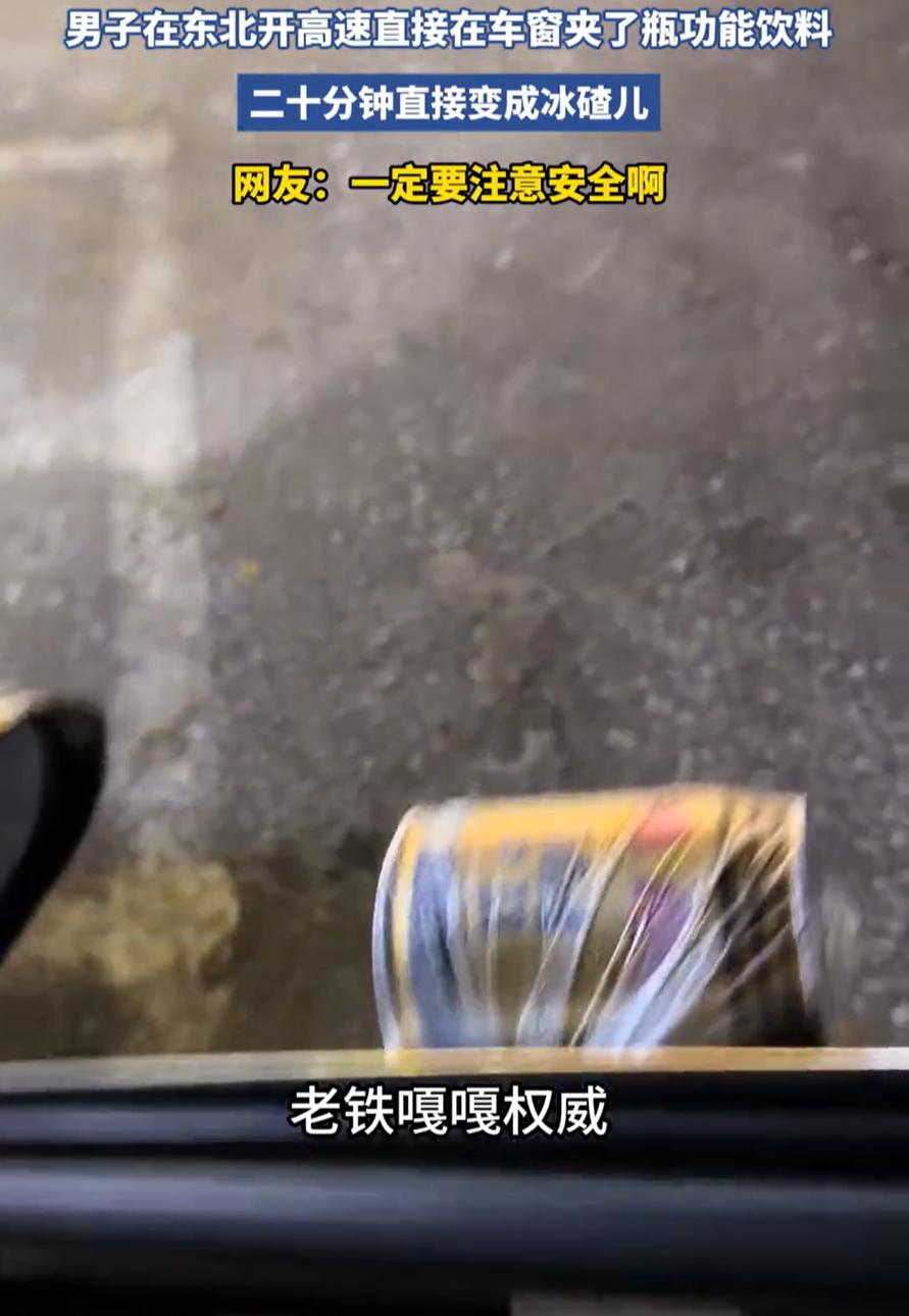 无知者无畏!黑龙江,一男子开车上高速,因为想喝点凉快的饮料,就突发奇想,将一瓶功能性饮料夹在车窗上,在高速上跑了20分钟直接冻成了冰碴,他觉得自己很聪明,还将此事分享到网上,但网友却表示要严惩 视频中,男子分享自己的方法,他先是找来一个塑料袋把饮料套上,然后用车窗夹住塑料袋,就这样一路跑高速,饮料就被冻成了冰碴,而男子分享方法时,还相当自豪,表示这一招“嘎嘎权威” 有网友当场提出质疑:你一点安全意识都没有么?这么大的安全隐患,飞出去砸到后面车挡风玻璃,造成别人的安全问题,你是一点都不考虑啊!交警应该重罚这种人! 咱们冷静想想,高速上扔个瓶子都可能砸坏车,何况是故意把瓶子夹在车窗上。车辆行驶时,尤其是高速状态,风力大,振动强,瓶子很容易松动脱落。一旦飞出去,对后车就是一枚“小炮弹”。前车可能毫无感觉,后车却可能挡风玻璃碎裂,甚至引发更严重的连环事故 这已经不是第一次有人为了图省事或找乐子,在行车时做出危险举动了。之前还有人把手机架在车窗上拍视频,或者把手伸出天窗,都觉得“就一会儿,没事”。可事故往往就发生在“一会儿”里 可能有人觉得,一个饮料瓶而已,至于这么上纲上线吗?问题就在于,很多驾驶者对于行车安全的理解还停留在“自己小心开就行”的层面,忽略了车辆在公共道路上是一个移动的“社会单元”,自己的一举一动都可能影响他人