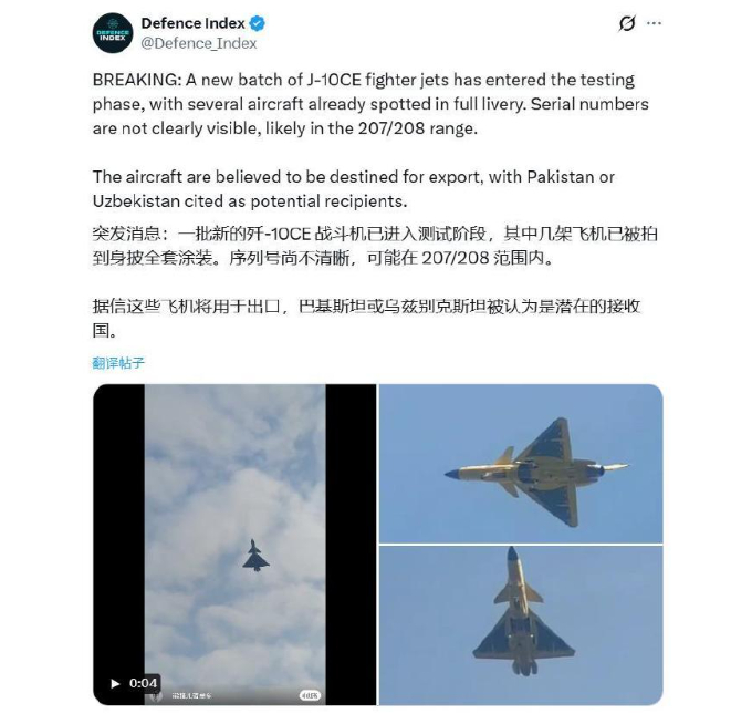 大批歼-10CE频繁试飞,美媒文章充满了焦虑,担心弱国将能抗衡西方!最近,美国防务索引网站称,多架全新的歼-10CE战斗机正在密集试飞。这些新机几乎是为海外客户准备的。文章还推测了谁是买家。最有可能的是巴基斯坦和乌兹别克斯坦。前者早已是歼-10CE的用户,在2025年5月7日那场震惊南亚的空战中,巴方使用该型战机击落了至少三架印度空军的“阵风”战斗机,创下三代半战机对战中的罕见战绩。而乌兹别克斯坦近年来也在寻求替换老旧苏式战机,其与中方在防务合作上的互动日益频繁,采购意向并不令人意外。后续排队的国家名单更长:孟加拉、埃及、伊朗、沙特……这些国家有一个共同点——它们在传统军事体系中被归类为弱国。如今,歼-10CE的出现,给了它们一个前所未有的选项:以相对低廉的价格,获得具备超视距打击、有源相控阵雷达、先进数据链和PL-15E远程空空导弹的现代化四代半战机。这正是美西方焦虑的根源。过去几十年,西方通过技术垄断和出口管制,牢牢掌控着高端空中力量的分配权。像F-16、F-15、甚至“阵风”这类战机,即便卖给盟友,也往往内置“后门”或限制关键功能——比如在涉及以色列或美国利益冲突时,武器系统可能被远程禁用。马岛战争期间法国对阿根廷“超级军旗”的技术支持中断,就是典型案例。但歼-10CE不同。它不受第三方干预。更重要的是,实战已经验证了它的战斗力。歼-10CE彻底打破了“西方战机技术不可逾越”的神话。对美国及其盟友而言,这意味着战略平衡正在被重塑。一旦中东、南亚、北非的多个国家批量列装歼-10CE,西方在局部冲突中的空中优势将不再理所当然。国际局势