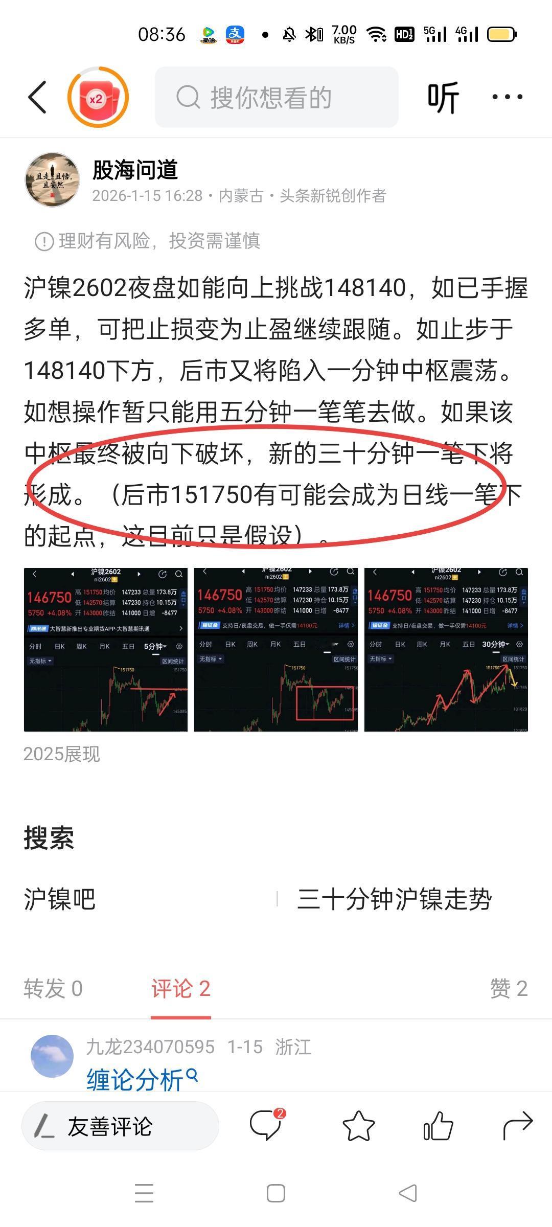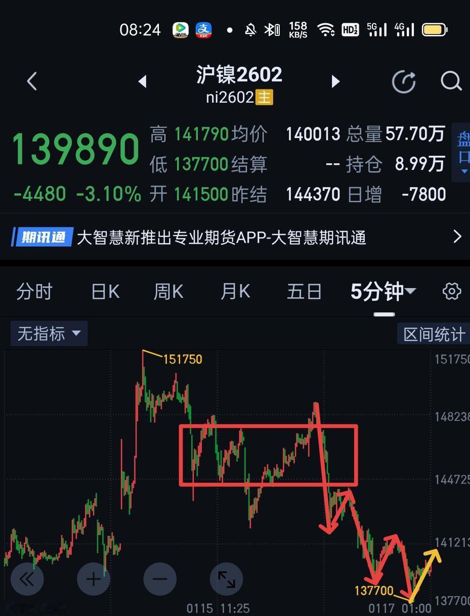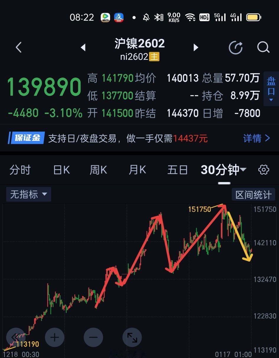 沪镍2602,一定要把控好节奏。如果昨天手握空单做的是三十分钟一笔下,可以适时的把止损调整为止盈来保护利润,然后跟随空方子弹继续飞一程。目前结构上仍是三十分钟一笔下的过程中,次级别处于第二个一分钟中枢构建中。周一,当下的五分钟一笔上如完成于141390上方,要防止回落不创新低,继而结束三十分钟一笔下。完成于141390下方,则需观察是否围绕新的一分钟中枢形成背驰。