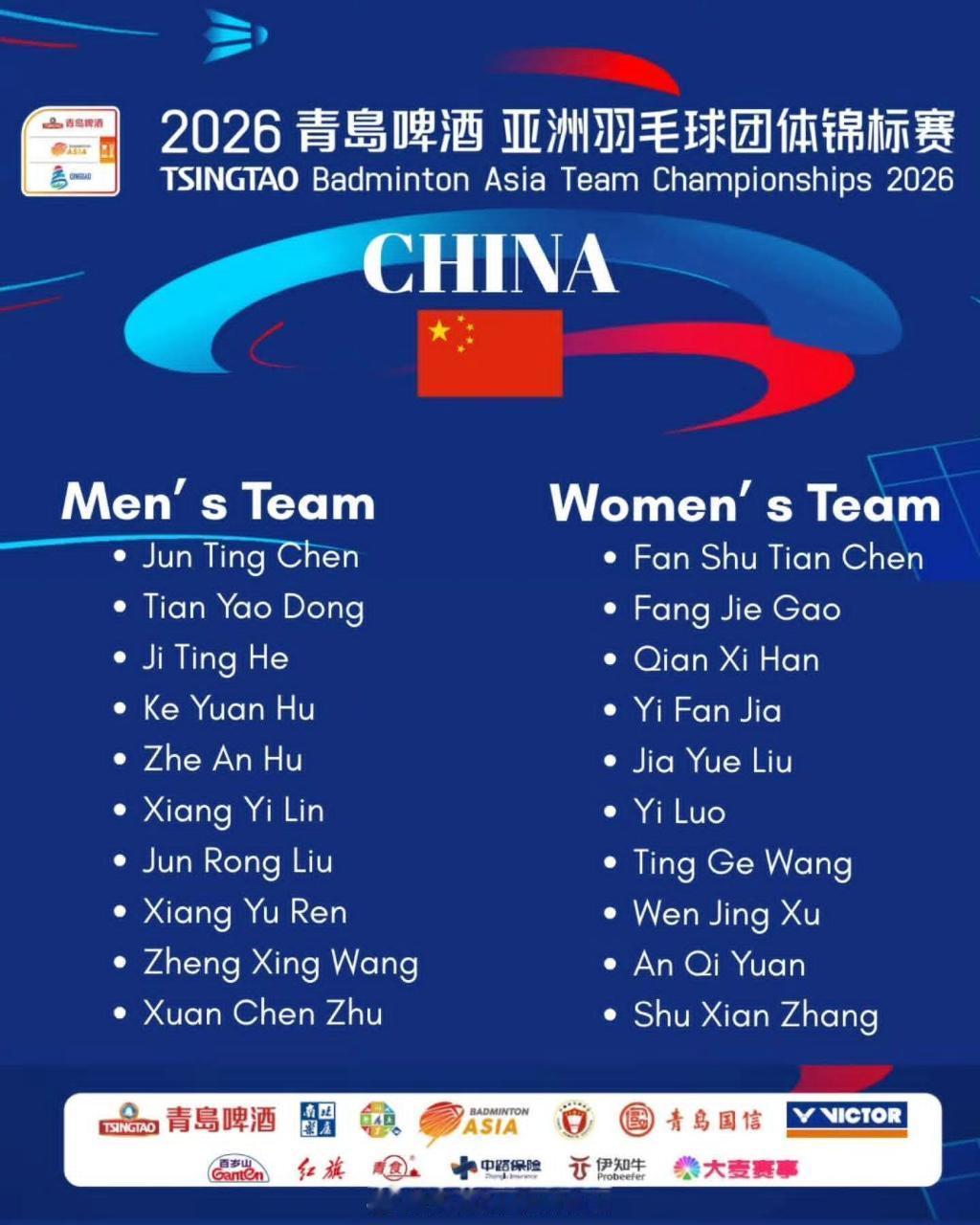 2026亚洲羽毛球团体锦标赛🇨🇳中国队名单出炉↓男队👦🏻:王正行、胡哲安、朱轩辰、董天尧、胡珂源/林祥毅、何济霆/任翔宇、陈俊廷/刘峻荣女单👧🏻:高昉洁、韩千禧、徐文婧、袁安琪、贾一凡/张殊贤、王汀戈/罗意、陈樊淑湉/刘嘉悦具体分组赛程——网页链接国羽亚团赛名单 羽毛球