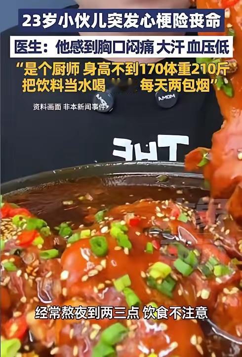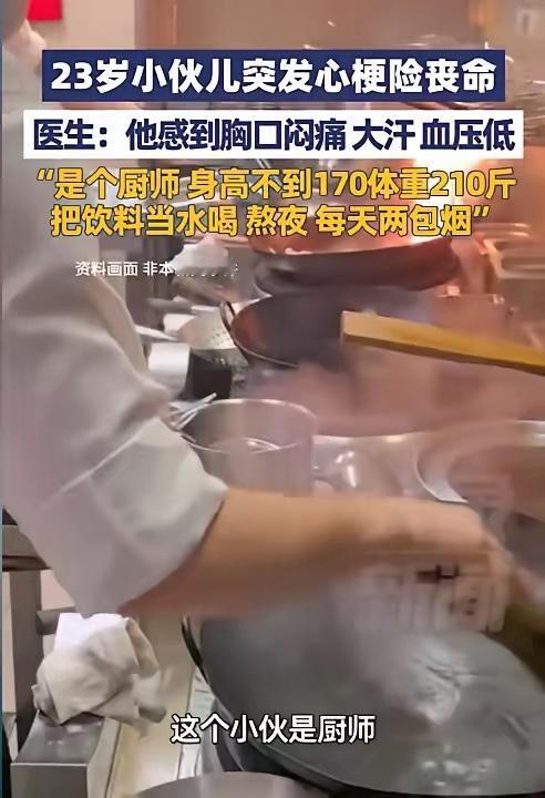 “太可怕了!”近日,一名23岁的厨师小伙,在后厨忙到凌晨收工时,突然剧烈胸痛、呼吸困难。同事吓得连夜送医,竟确诊为急性心梗!医生检查发现,身高不足170cm的他体重飙到210斤,还长期熬夜、日抽两包烟、把饮料当水喝,网友:这习惯我全中! 医院检查结果显示心血管造影他的冠状动脉出现了严重堵塞。急性心肌梗死,就是给心脏供血的血管被堵死了,心肌因为缺血而坏死。这种要命的急症,黄金抢救时间只有短短120分钟。 这么年轻的小伙,心脏怎么就“老”化得这么厉害?看看他的日常生活,体重严重超标,一天两包烟,把饮料当水喝,再加上长期熬夜。这些习惯每一个都在给他的心脏血管“埋雷”。尤其是吸烟,会让血管痉挛、硬化,大大增加心梗风险。高糖高脂的饮食和肥胖,更是直接导致动脉粥样硬化的元凶。 现在的心梗不是只有老年人才发生了,糟糕的生活方式让越来越多的年轻人心脏出现问题。熬夜、久坐、压力大、饮食不规律、缺乏运动……这些几乎成了很多年轻人的生活常态。 心梗发作前,身体除了典型的胸痛,还有很多非典型症状要警惕,比如胃痛、肩背疼痛、胸闷憋气、大汗淋漓等。如果这些不适持续超过20分钟,或者伴有濒死感,要立刻拨打120求救。 想要保护好心脏,从现在开始戒烟限酒,饮食保持清淡保持八分饱就好,每周保持适量的运动,控制好自己的体重和腰围,还有一定要保证规律充足的睡眠,定期体检,关注好自己的血压、血糖、血脂指标,有异常情况及时咨询医生。 每一次熬夜、每一根烟、每一口不健康的饮食,都可能给心血管系统增加负担。别等到身体发出最后通牒才后悔莫及,年轻真的不是挥霍健康的资本。 各位读者你们怎么看?欢迎在评论区讨论。