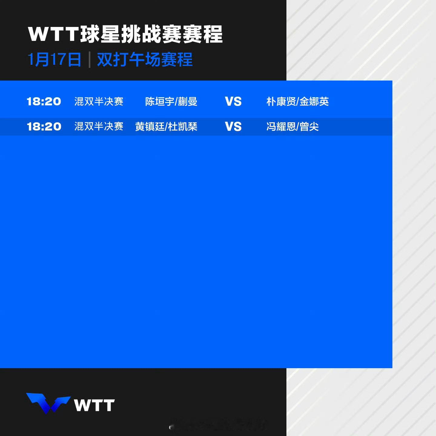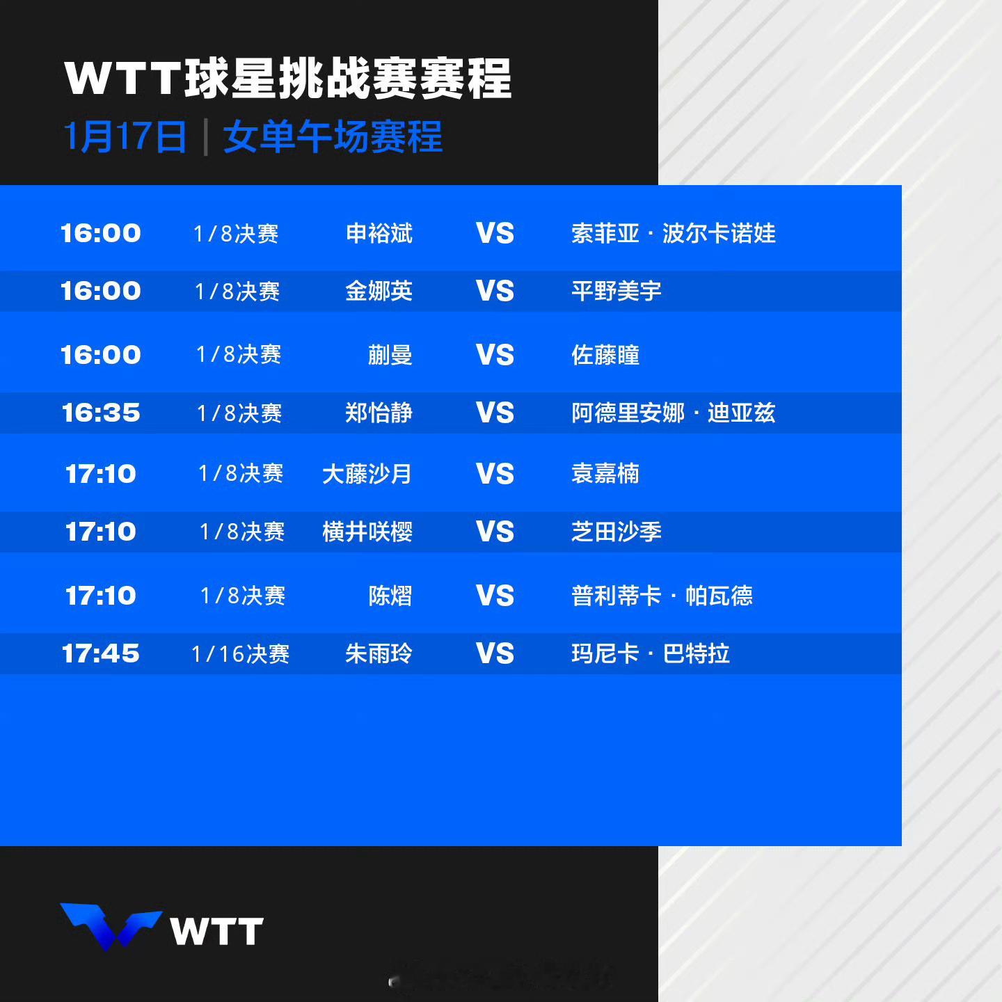 WTT球星挑战赛多哈站国乒1月17日赛程16:00 蒯曼vs佐藤瞳16:35 向鹏vs高兹16:35 温瑞博vs林德16:35 周启豪vs篠塚大登17:10 黄友政vs郭冠宏17:10 陈熠vs帕瓦德17:45 薛飞vs张本智和17:45 林诗栋vs奥恰洛夫18:20 蒯曼/陈垣宇vs金娜英/朴康贤22:00 男单、女单1/4决赛00:55(+1)男双决赛 黄友政/温瑞博vs张禹珍/赵大成1月多哈抢分季
