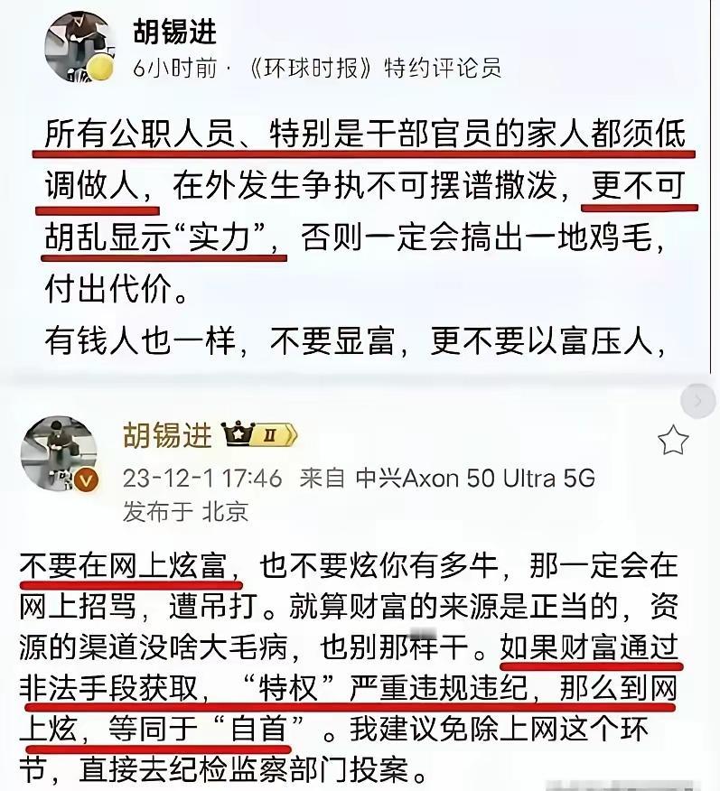 可怕的思维路径,胡锡进从头到尾担忧的不是国家财产被人蚕食,也不是担忧民脂民膏被人吸食,他处处担忧的全都是贪官污吏的安全,担心他们被人民发现。 2020年8月8日他在微博发长文回应质疑,字里行间都在为官员财产不公开找借口。 他说自己作为公职人员每年都填个人事项报告,护照还得交给报社管理,连越南一日游都没法随便去,以此证明监管有多严。 可这根本说明不了问题啊!组织内部申报和对公众公开,完全是两码事,普通老百姓根本没法监督,这不是明摆着遮遮掩掩吗? 他还直言“坚决反对”官员财产网上公示,给出的理由让人跌破眼镜。 一会儿说世界上绝大多数国家都不向公众公示,一会儿又说公职人员也需要隐私,甚至扯现有申报制度已经足够强有力。 十八大后确实有10%的抽检率,他身边也有人漏填房产、车库被严查,但这就能替代公众监督了? 2023年5月他又发文强化观点,说公开财产会危害社会稳定,还把鼓吹公示的人骂成“居心叵测、其心可诛”,说人家是故意煽动民粹。 真的让人费解,公众想要阳光监督,让权力在阳光下运行,怎么就成了煽动民粹? 中纪委二十届五中全会早就明确定调,反腐败是输不起的斗争,要“有腐必反、有贪必肃、除恶务尽”。 可胡锡进偏偏对着干,还说公开财产会让合法收入被歪曲成“灰色收入”,引发社会对立。 他忘了老百姓最恨的就是贪官挪用血汗钱,而公开公示恰恰是遏制腐败最直接的办法,全球已有100多个国家和地区实行,怎么到他这就成了“危害稳定”? 更离谱的是,他说中国公职人员不是“有钱人群体”,真正有钱人在民营经济里。 这话没错,但普通官员合法收入光明正大,为啥怕公示?难道真像网友说的,怕一公开就露了马脚? 有调查显示超八成公众支持官员财产公示,连七成参与调查的公职人员都认同,他却视而不见。 越南早就要求1.33万元起申报财产并公示,日本也会公布内阁资产,这些国家没见社会动荡,反而减少了腐败空间。 他一边说少数蛀虫不能代表全体公职人员,一边又不让公众监督,这逻辑简直站不住脚。 如果官员行得正坐得端,公开财产只会赢得信任,只有心里有鬼的人才会怕阳光。 中纪委都在深化整治“蝇贪蚁腐”,他却在给腐败分子的财产安全“保驾护航”,这种价值取向真的让人难以认同。 作为前环球时报总编,本应呼吁完善反腐机制,他却反过来维护特权阶层的“隐私”,完全背离了公众的期待。 各位读者你们怎么看?欢迎在评论区讨论。